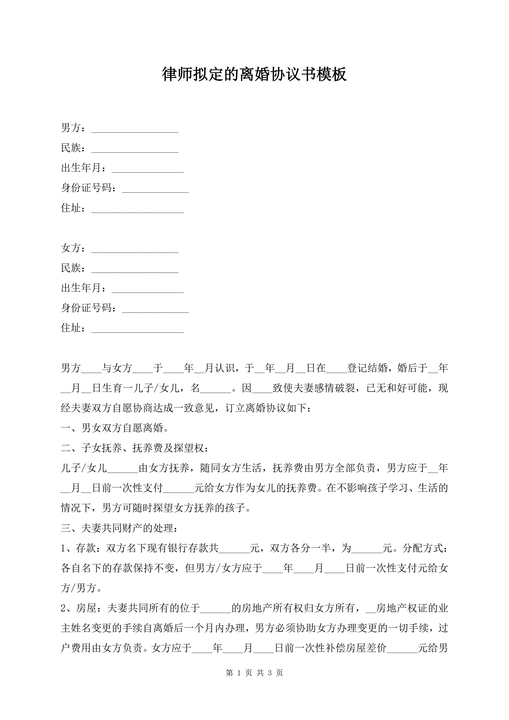 >律师拟定的离婚协议书模板