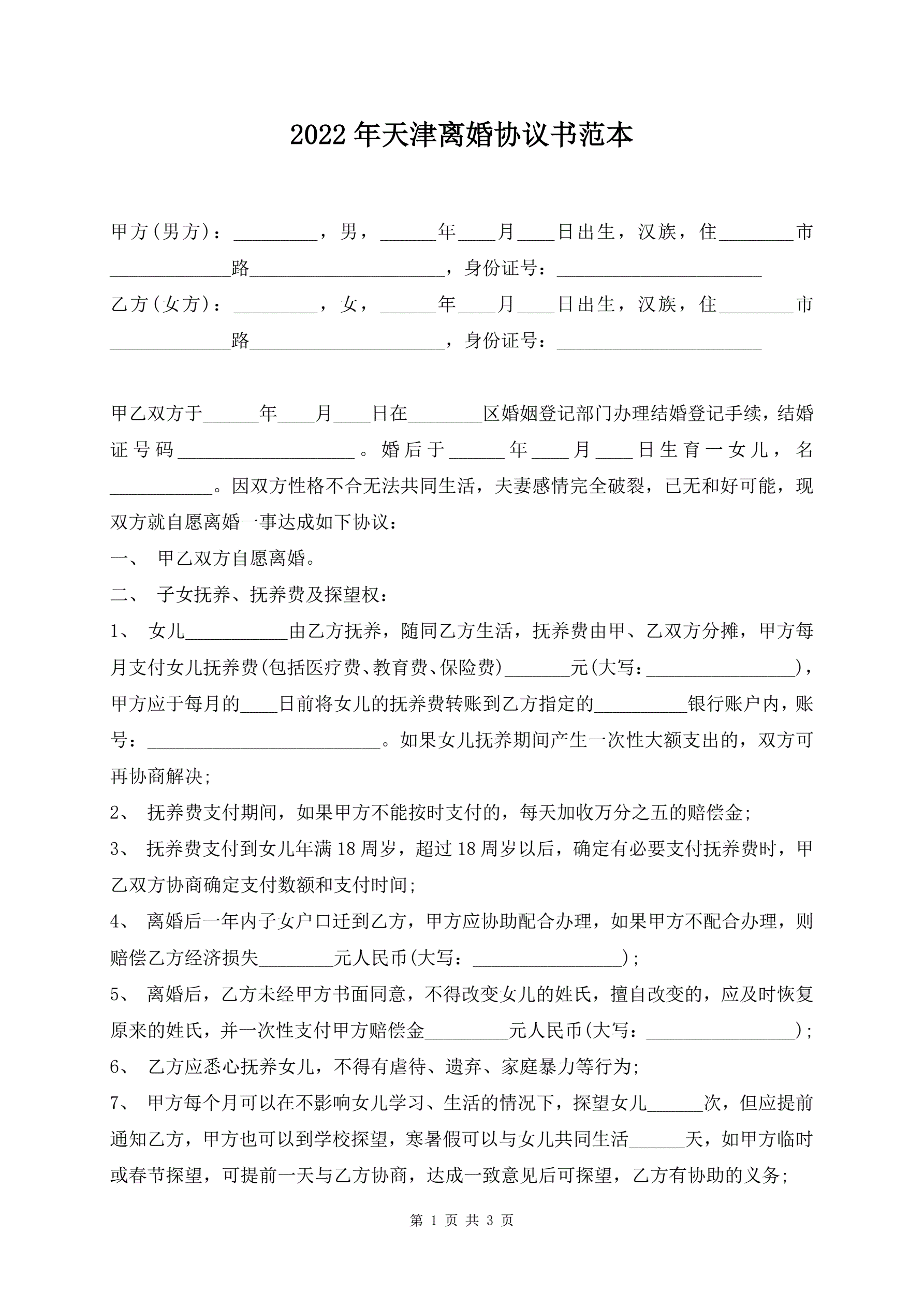 2022年天津离婚协议书范本