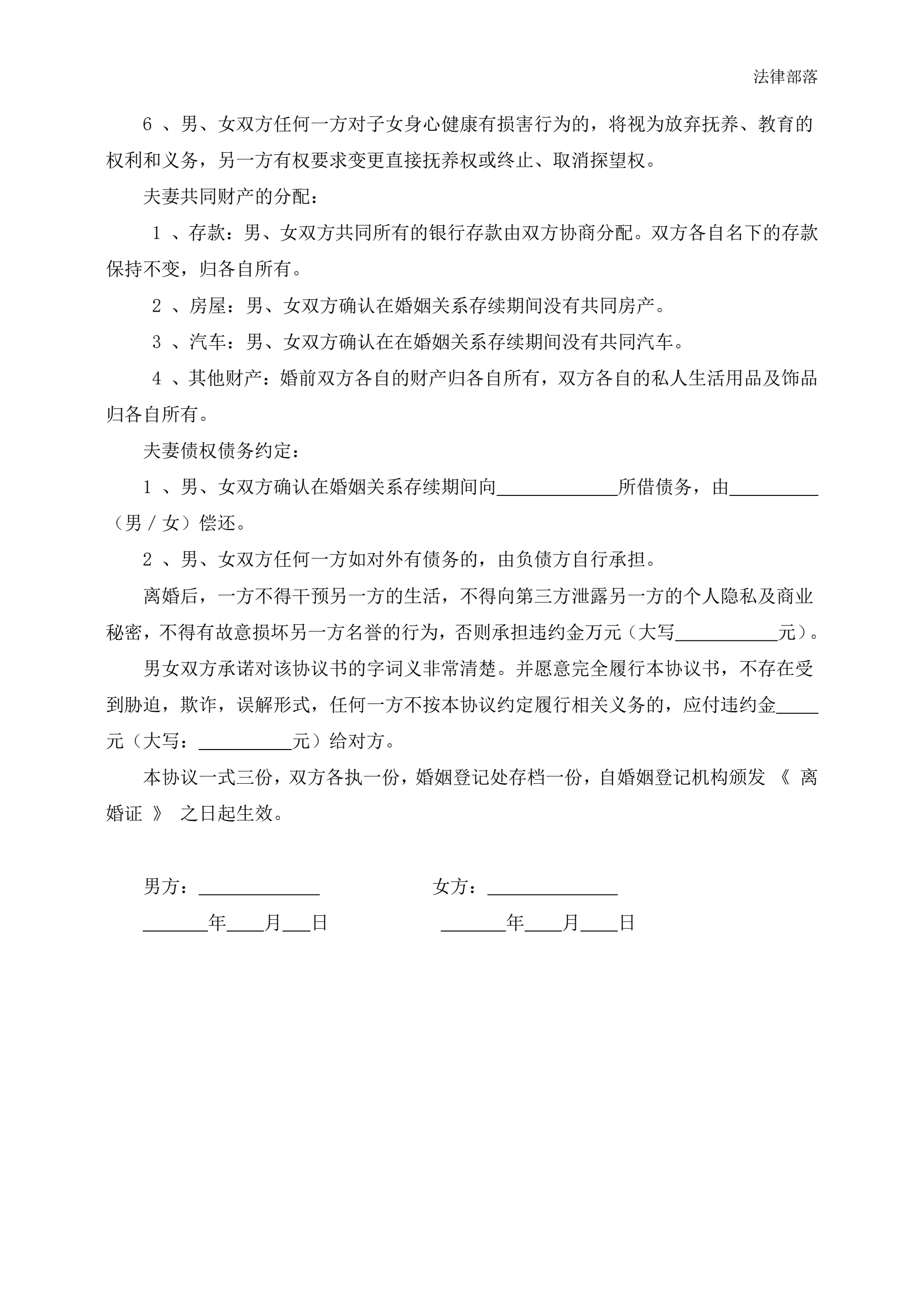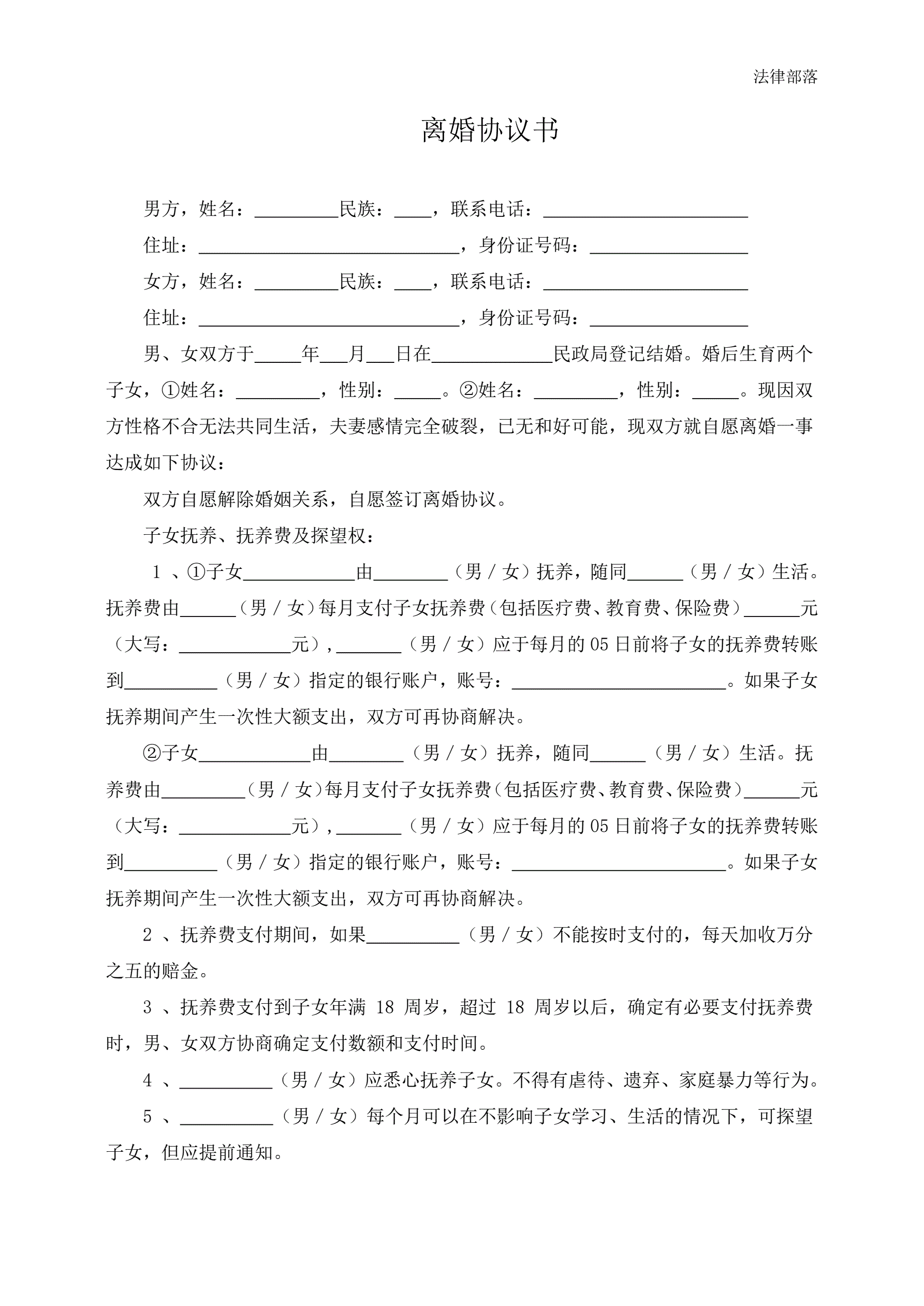 >离婚协议书书(无财产有债务2个子女)