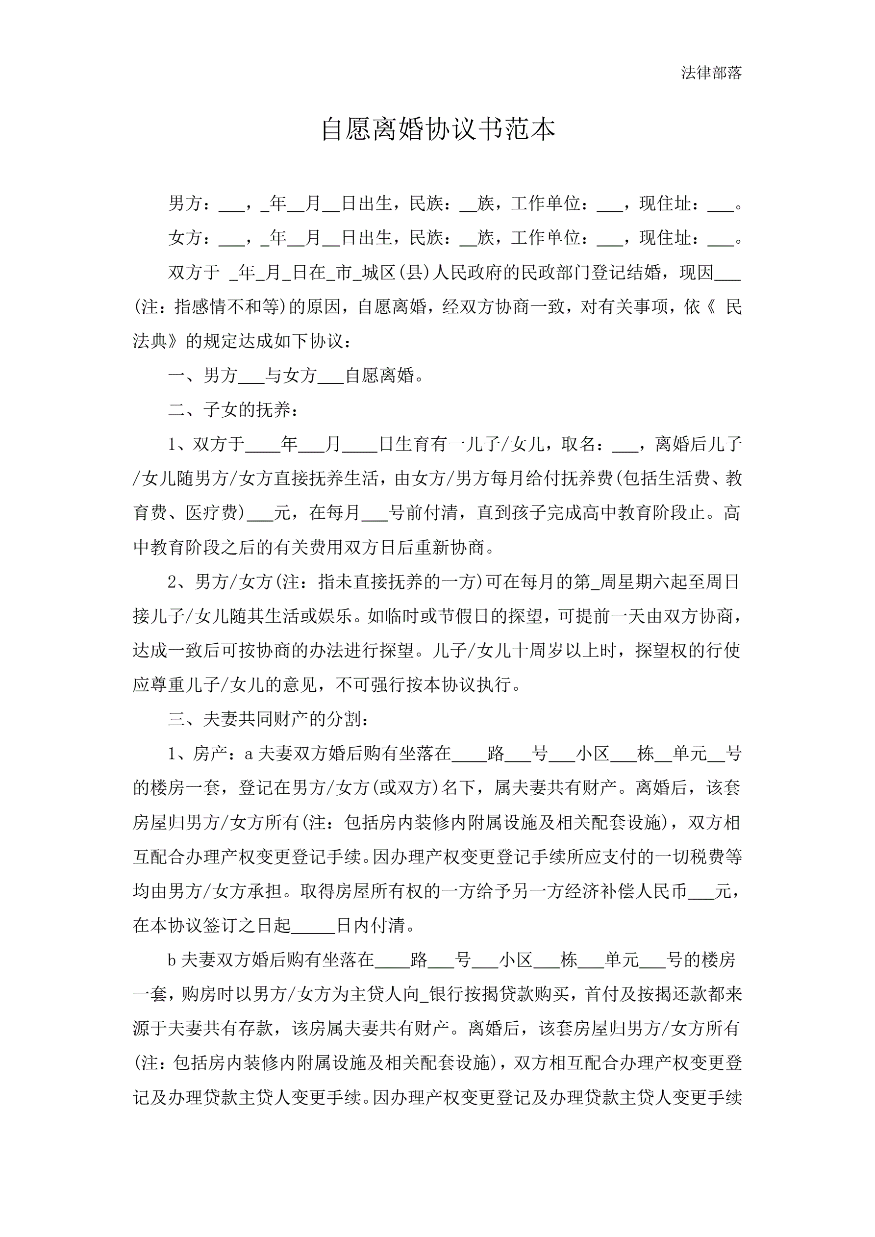 自愿离婚协议书范本最新
