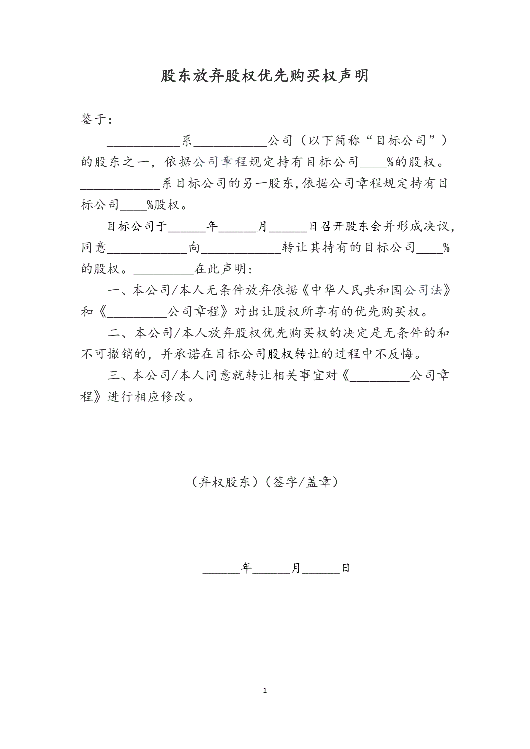 >股东放弃股权优先购买权声明(转让)(指导版)