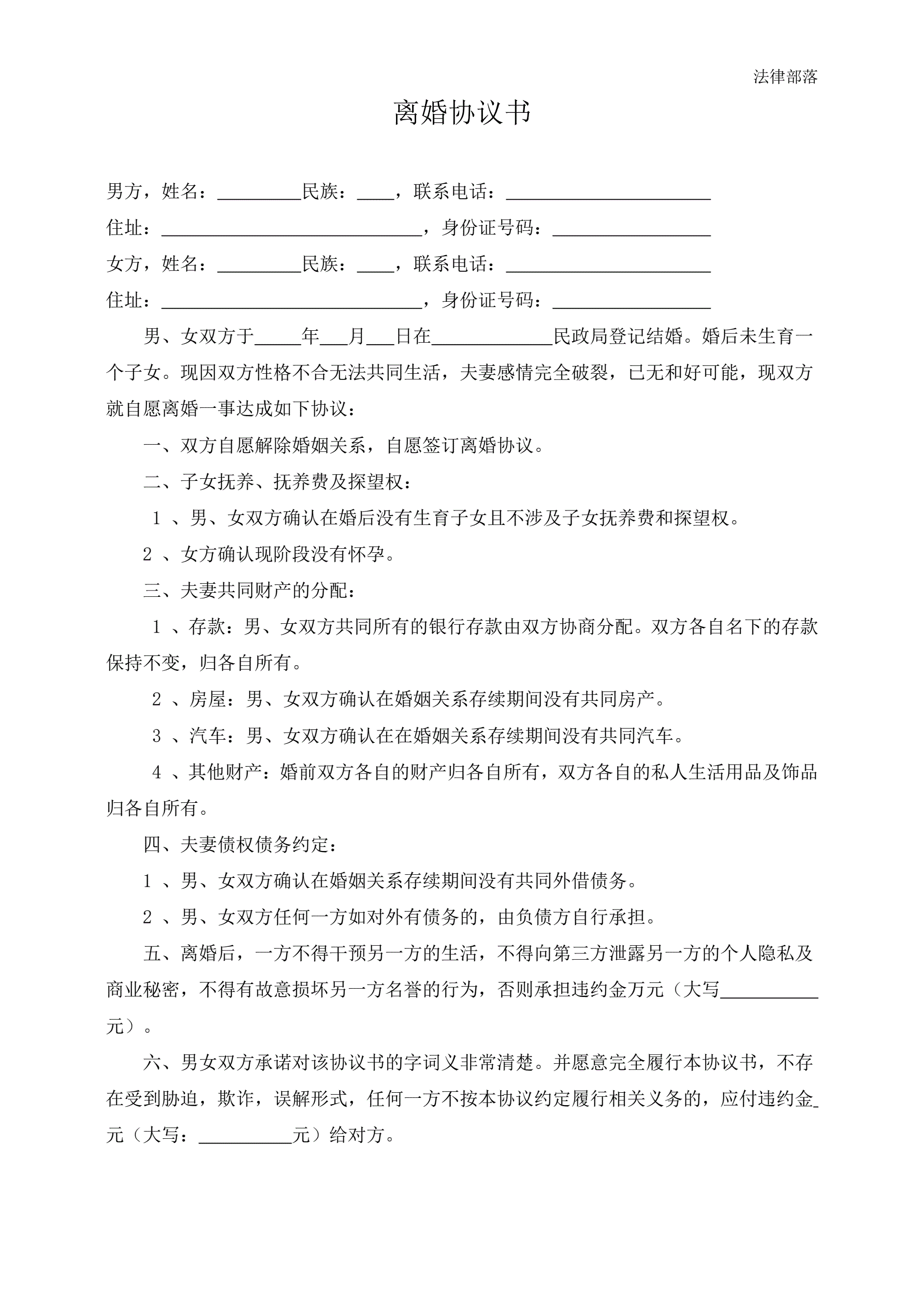 离婚协议书(简版)