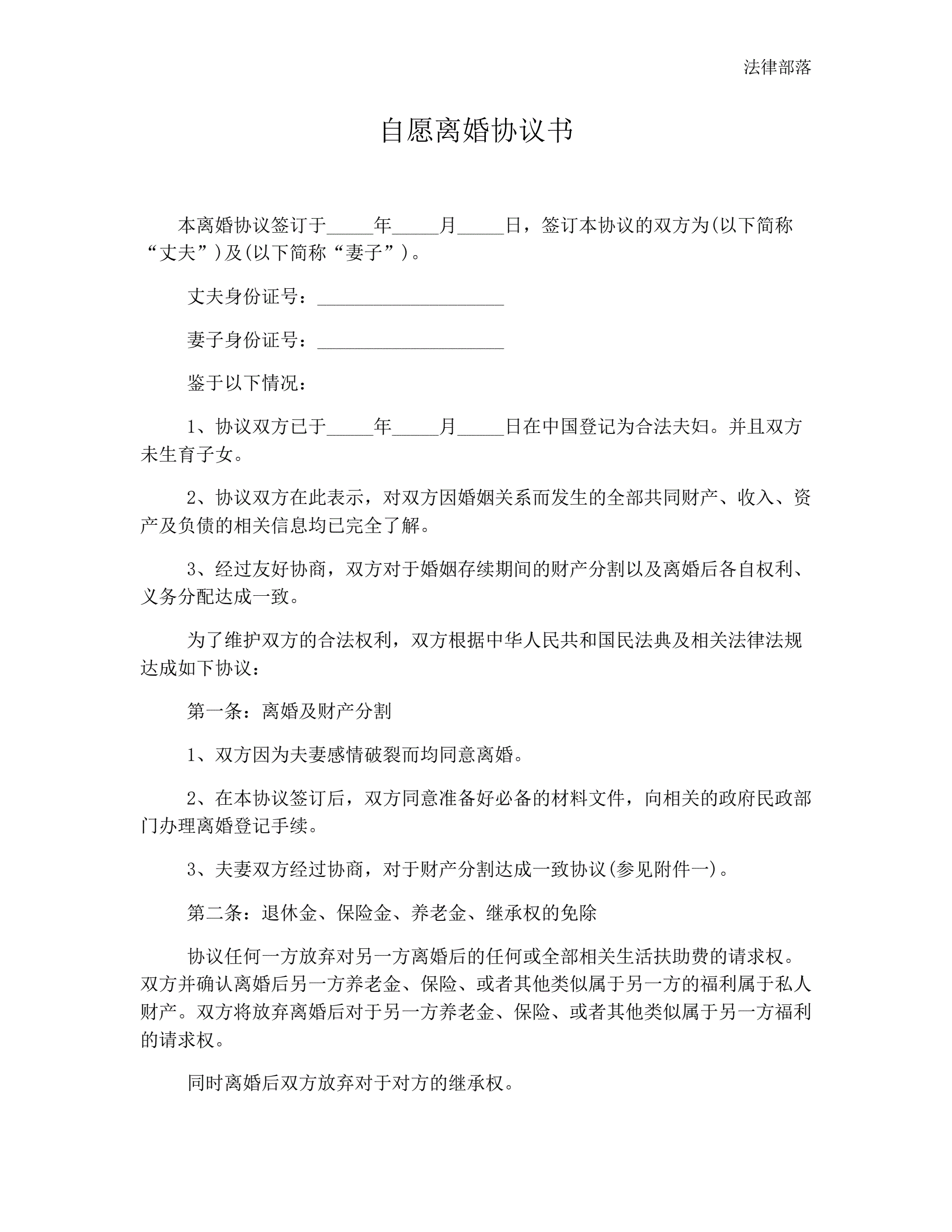 自愿离婚协议书模板