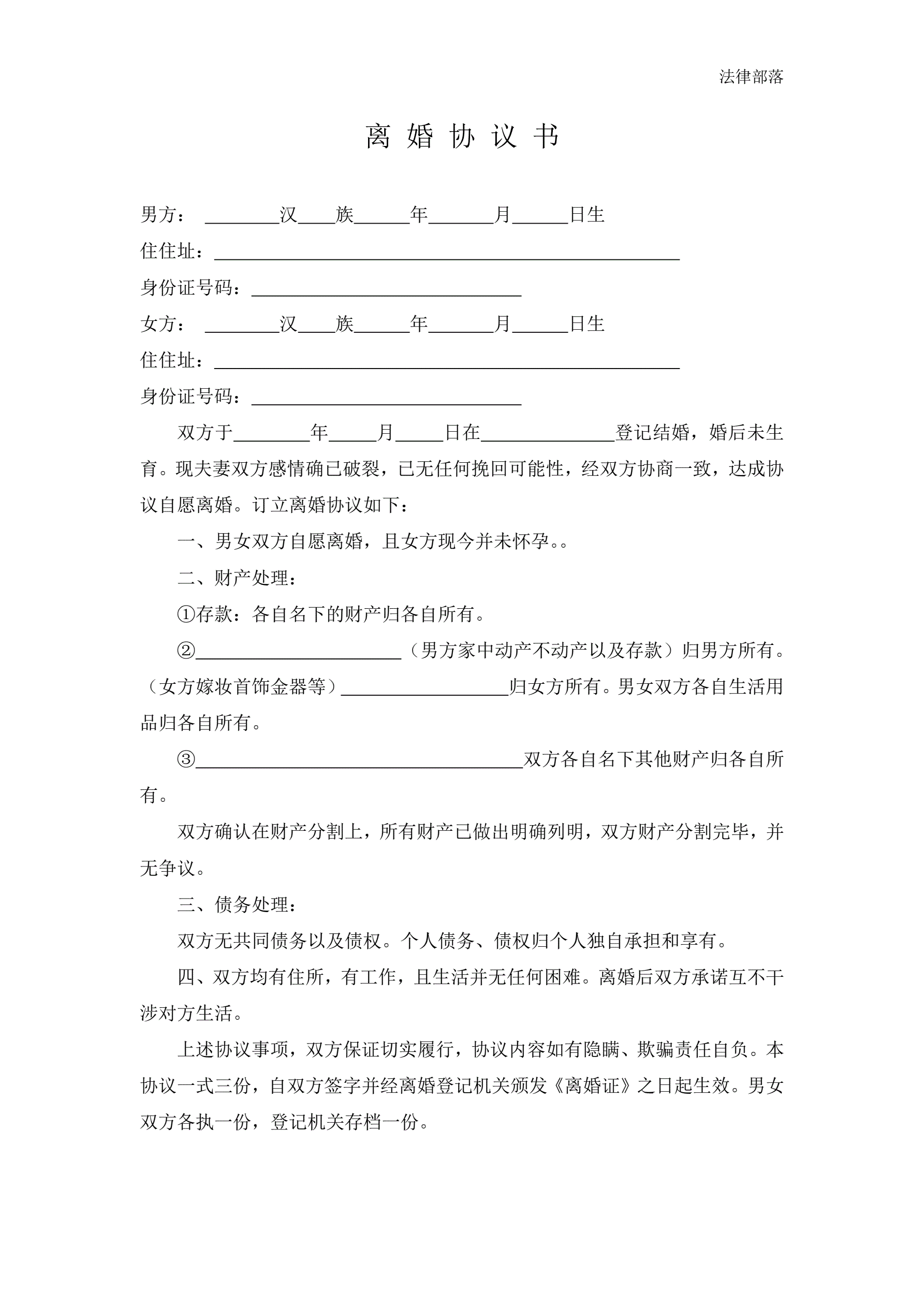 离婚协议书(有财产无子女)
