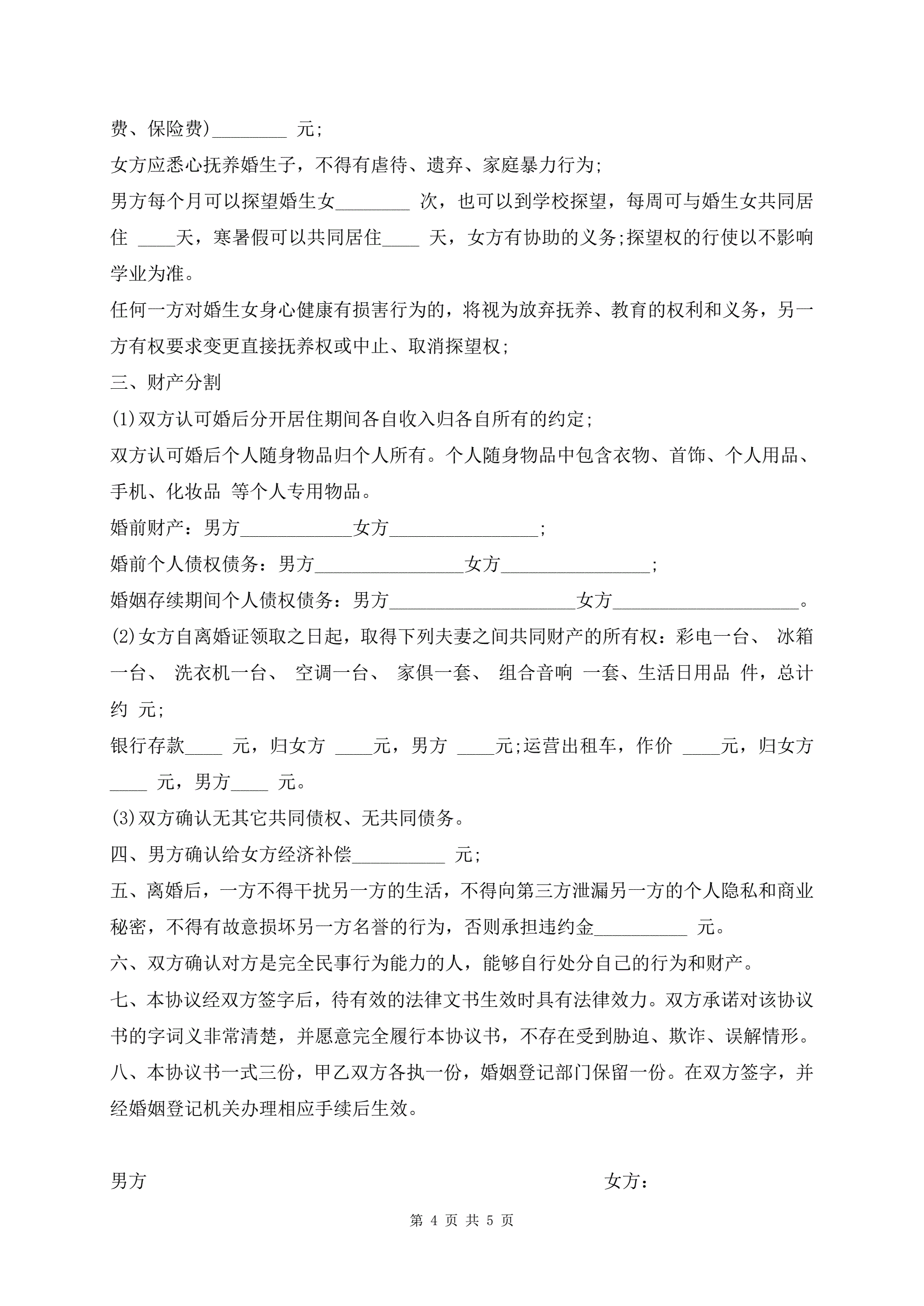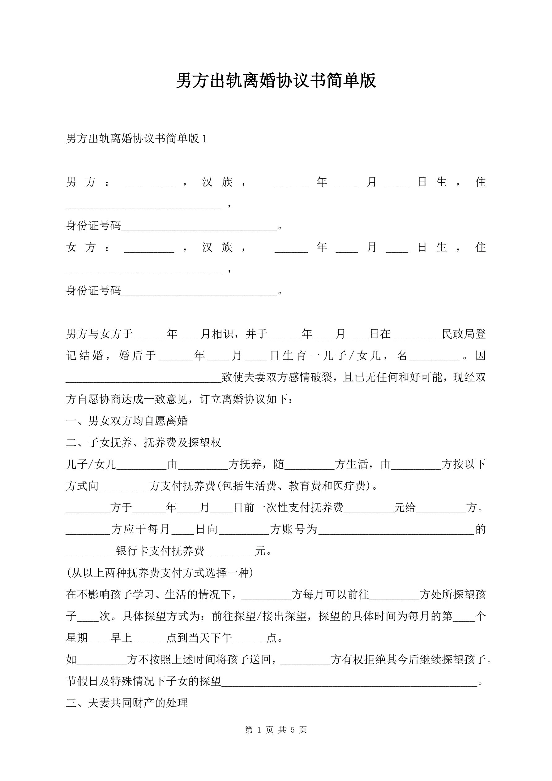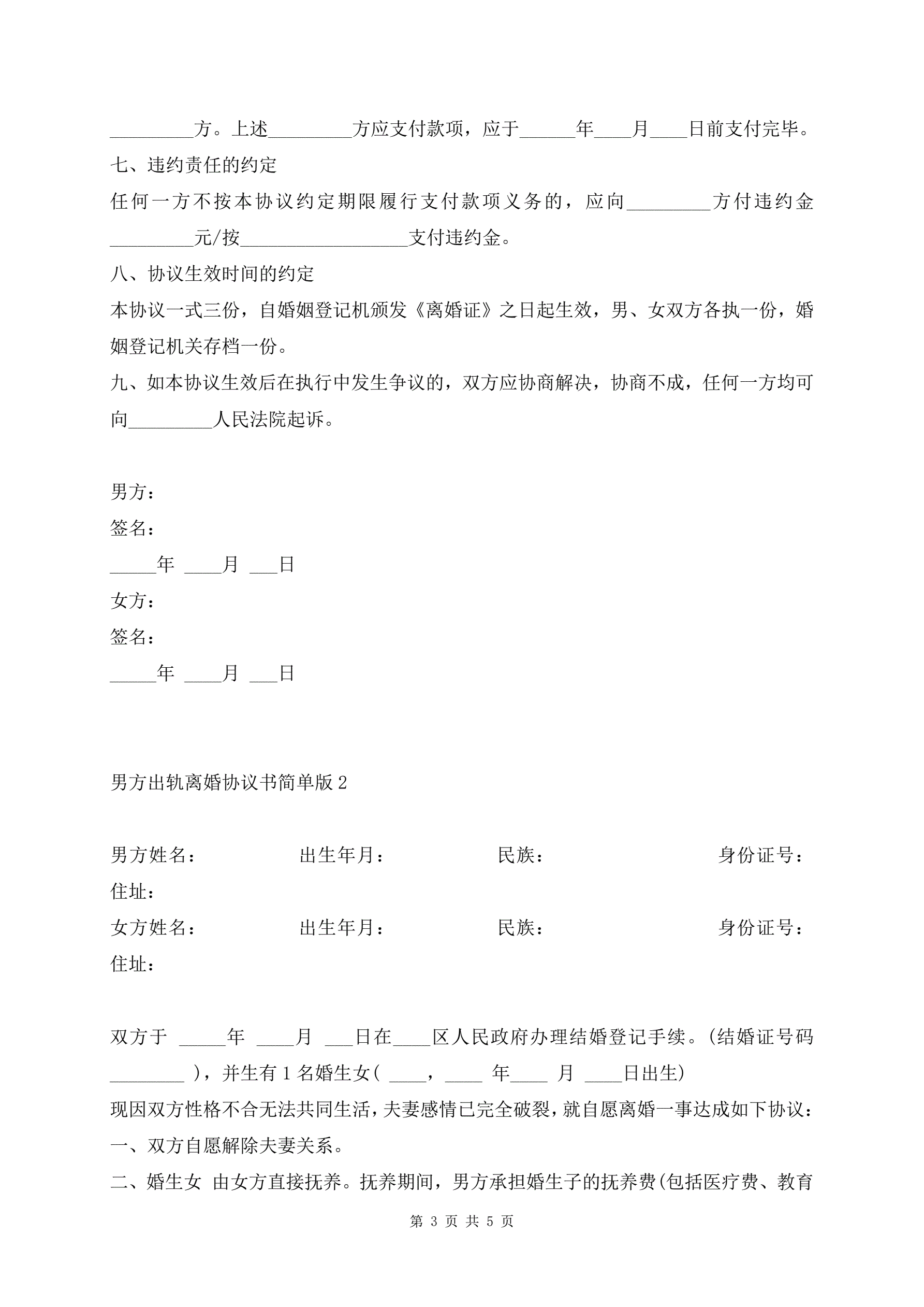 >男方出轨离婚协议书简单版