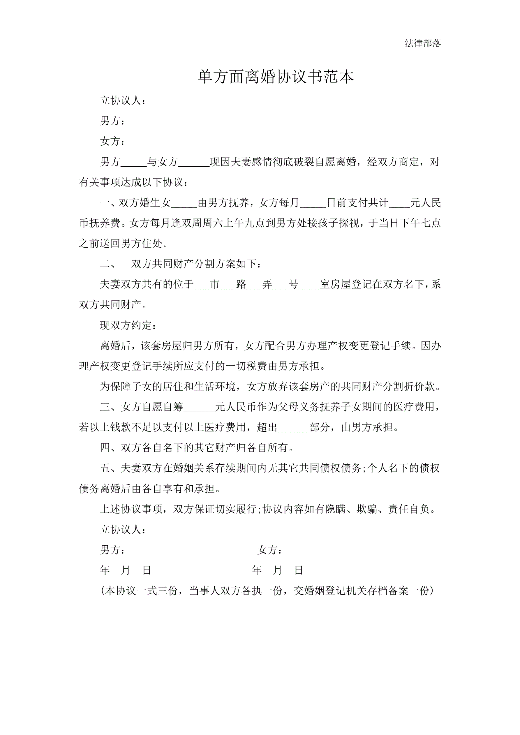 >单方面离婚协议书范本