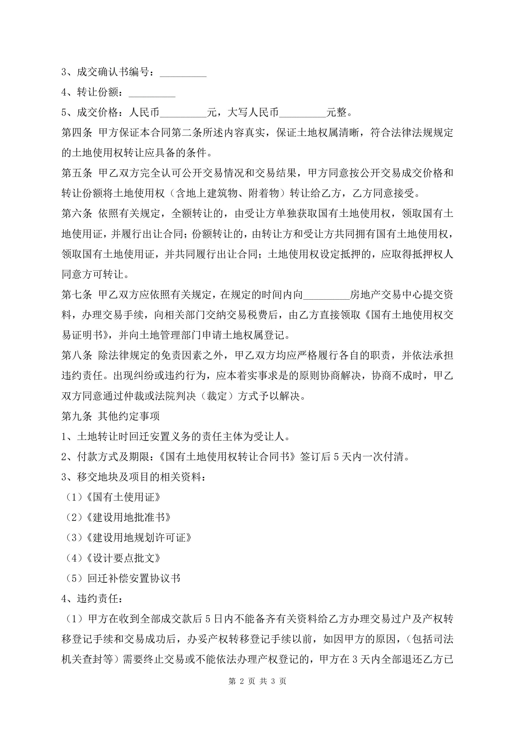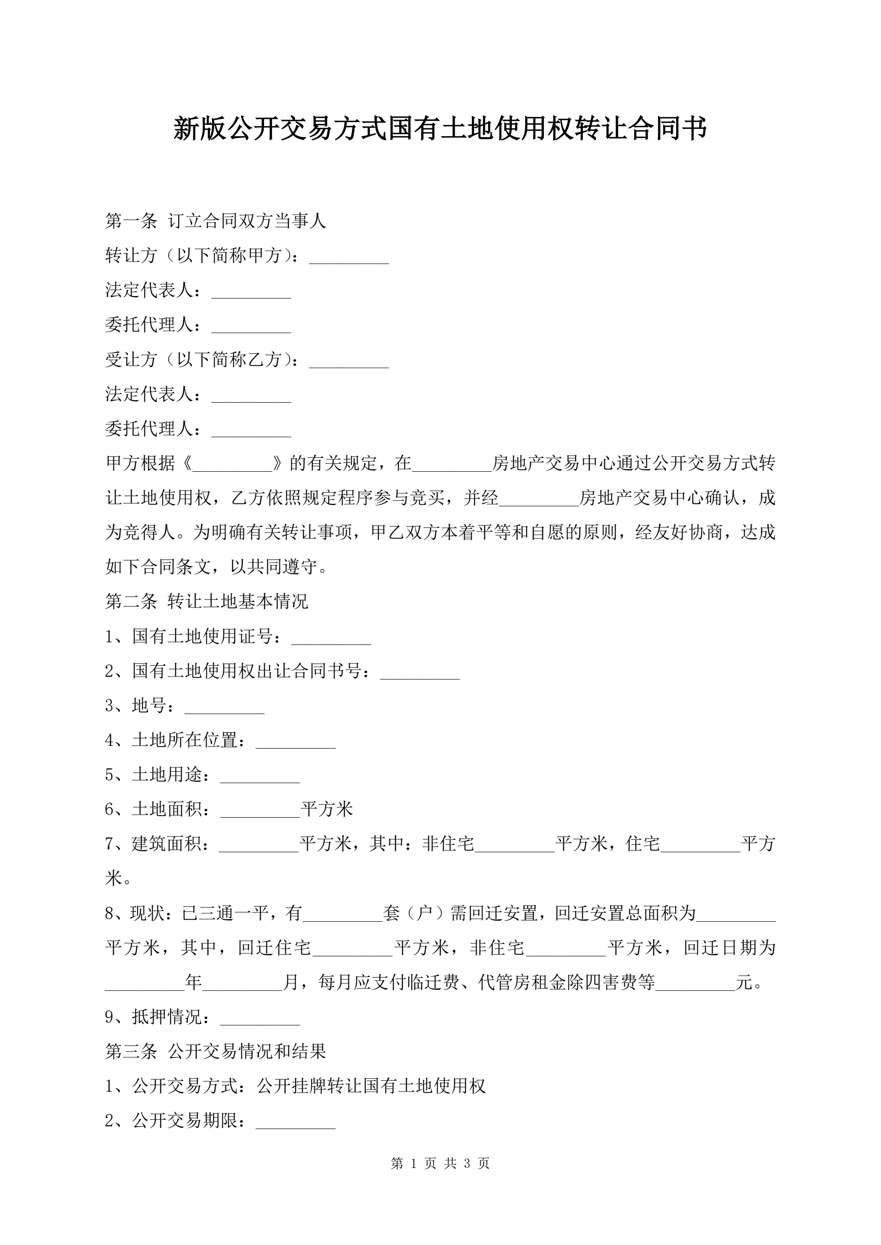 >新版公开交易方式国有土地使用权转让合同书