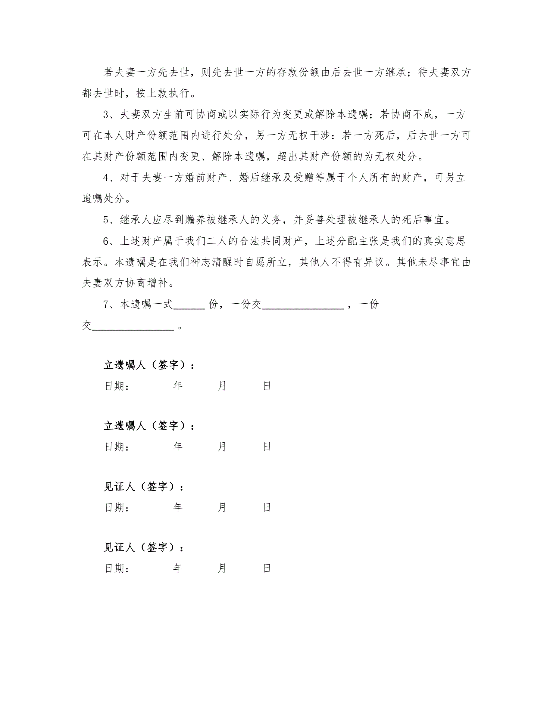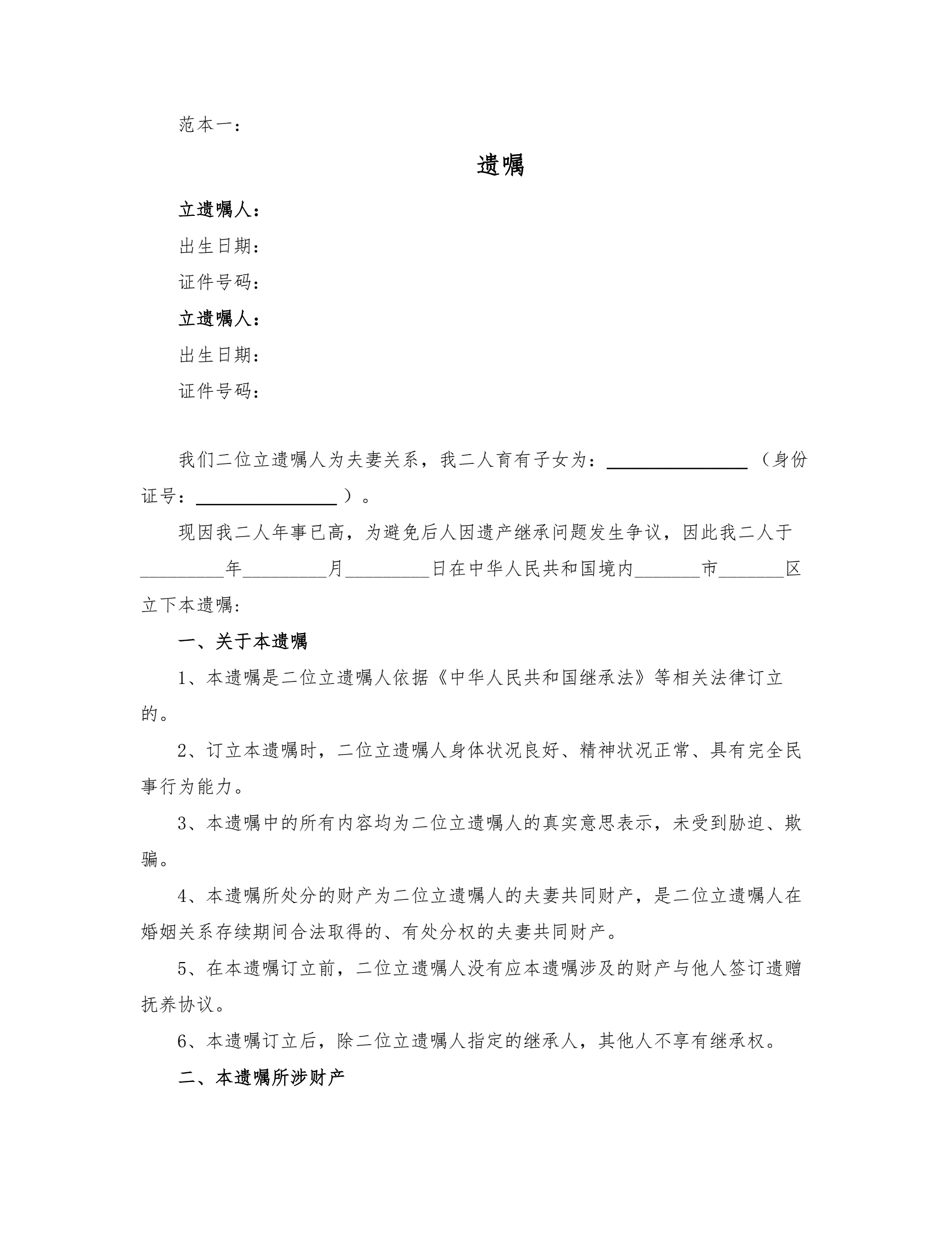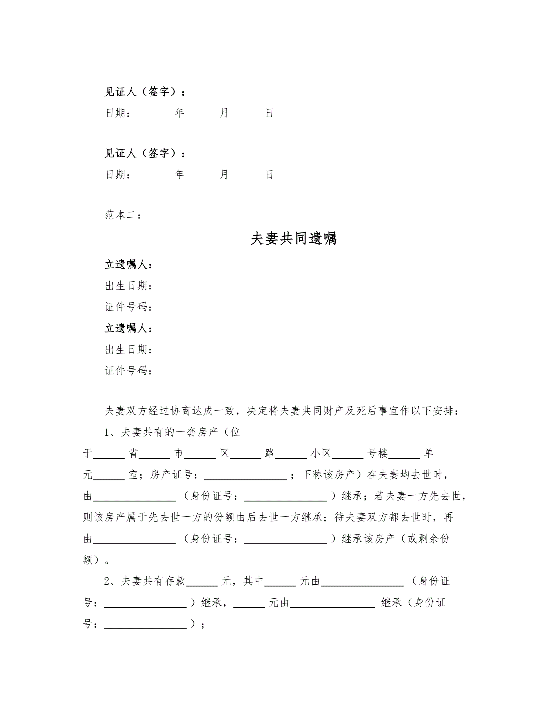 夫妻共同遗嘱(两种范本)