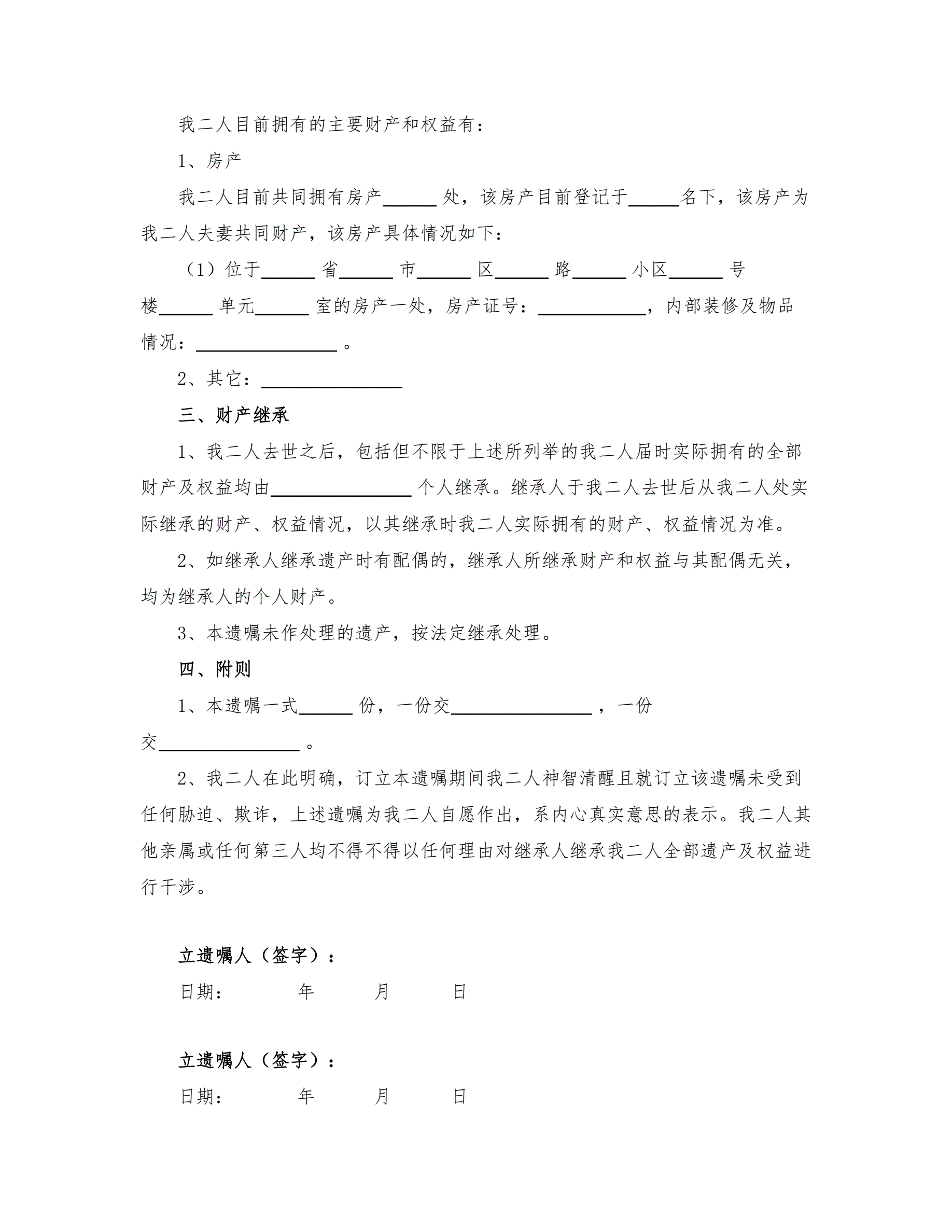 夫妻共同遗嘱(两种范本)