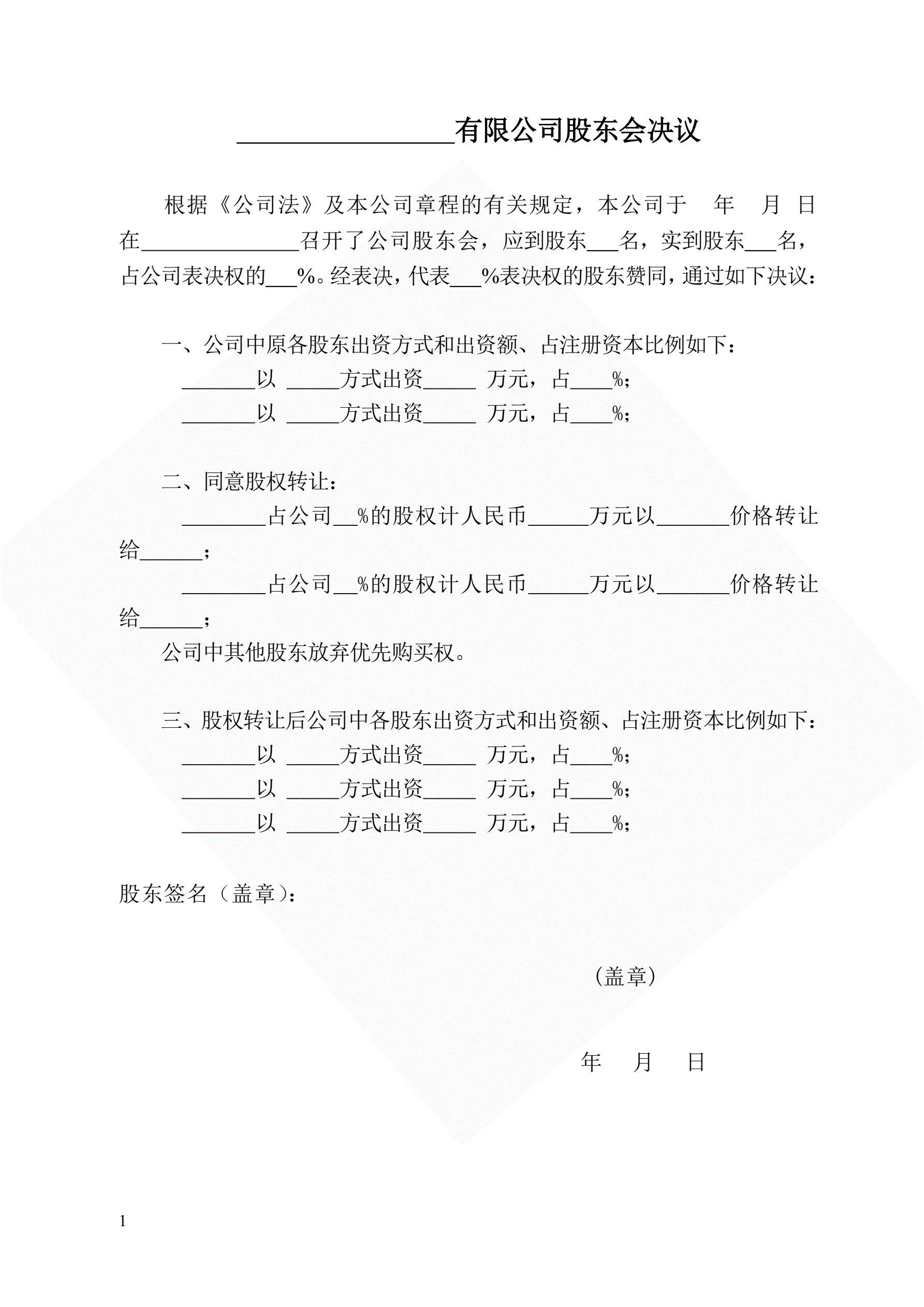 >股权转让股东会决议(指导版)