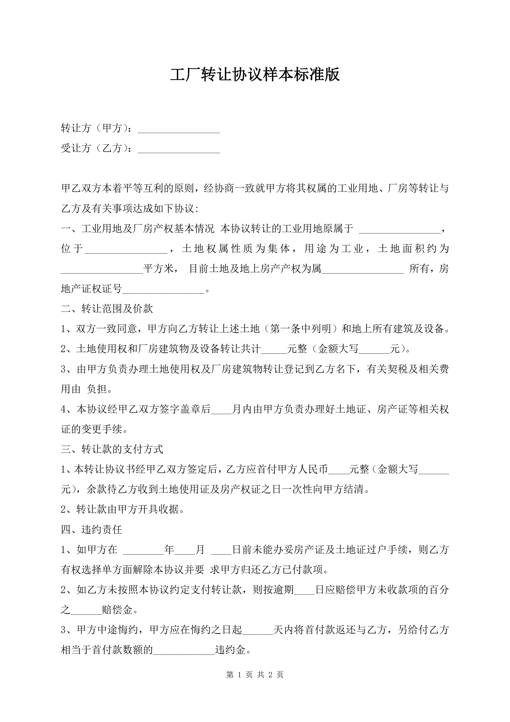 工厂转让协议样本标准版