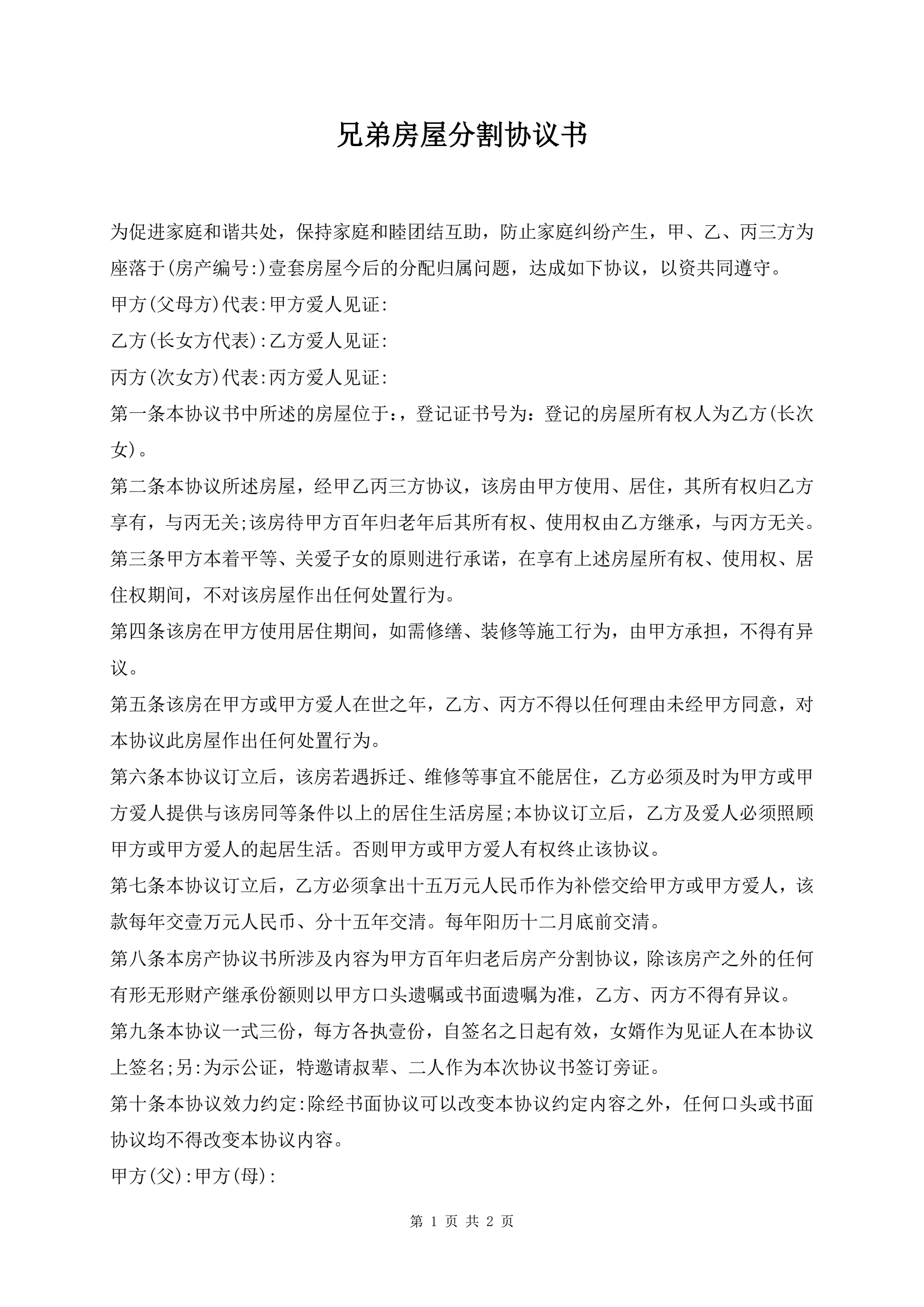 兄弟房屋分割协议书