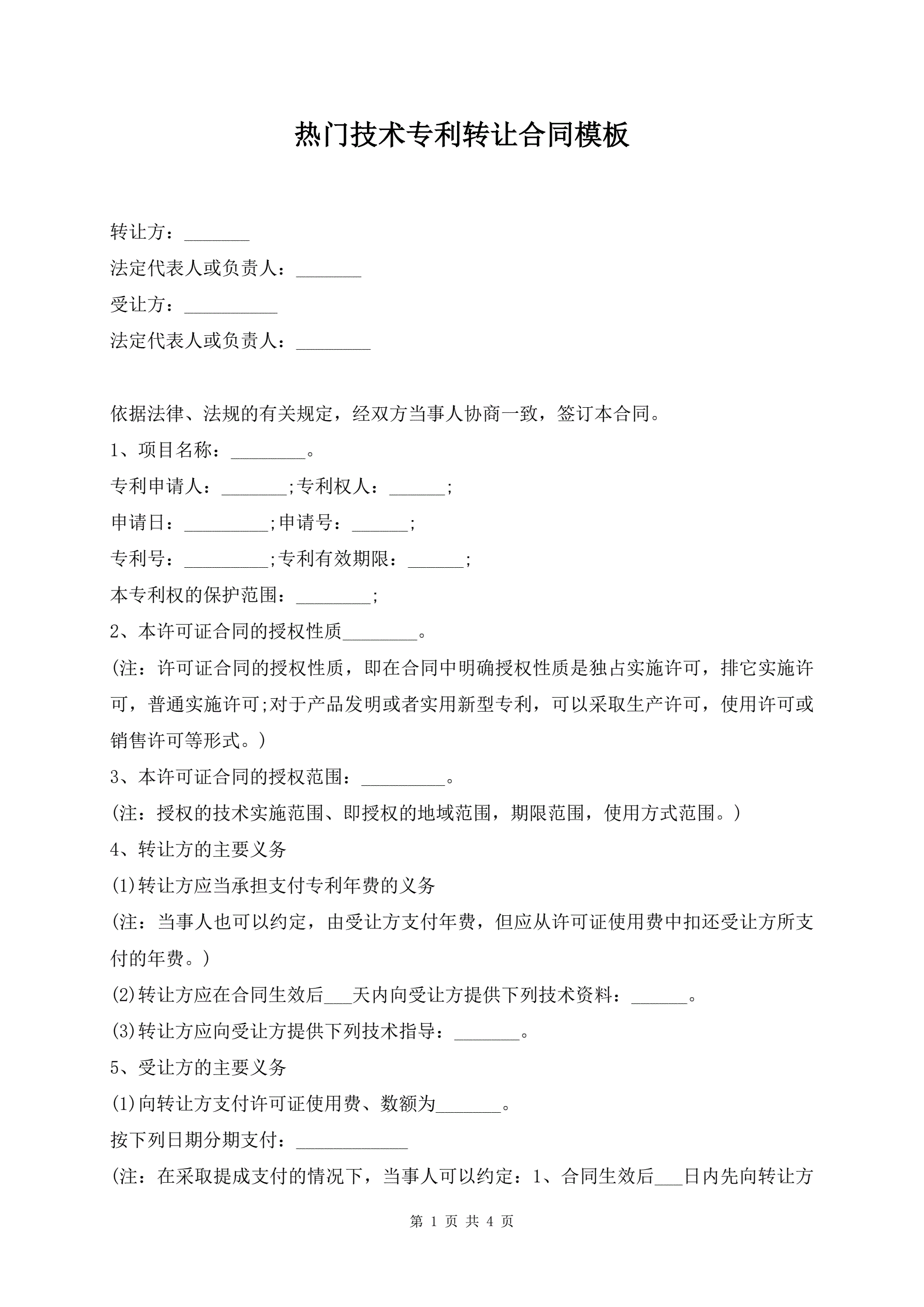 >热门技术专利转让合同模板