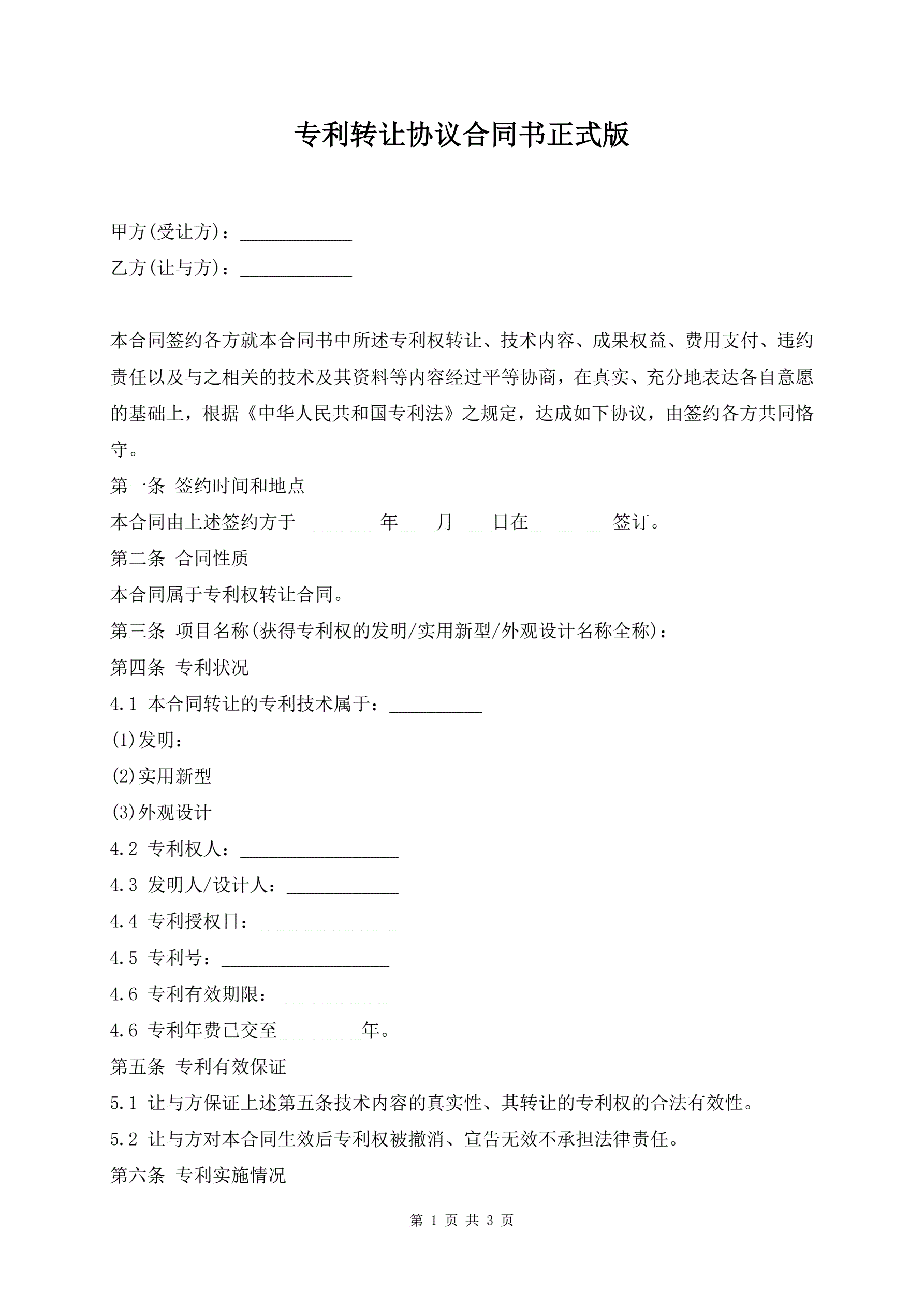 专利转让协议合同书正式版
