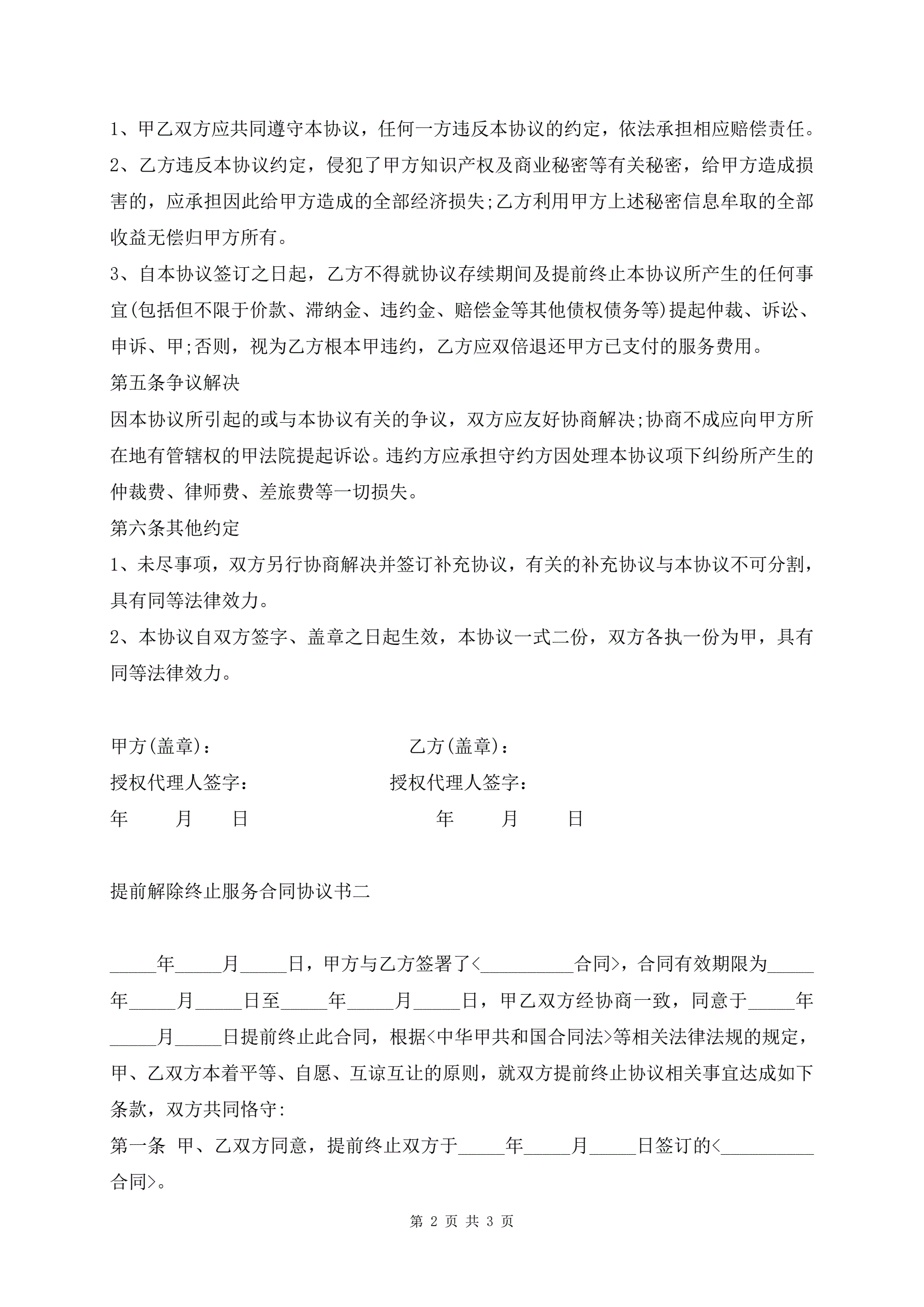 >提前解除终止服务合同协议书