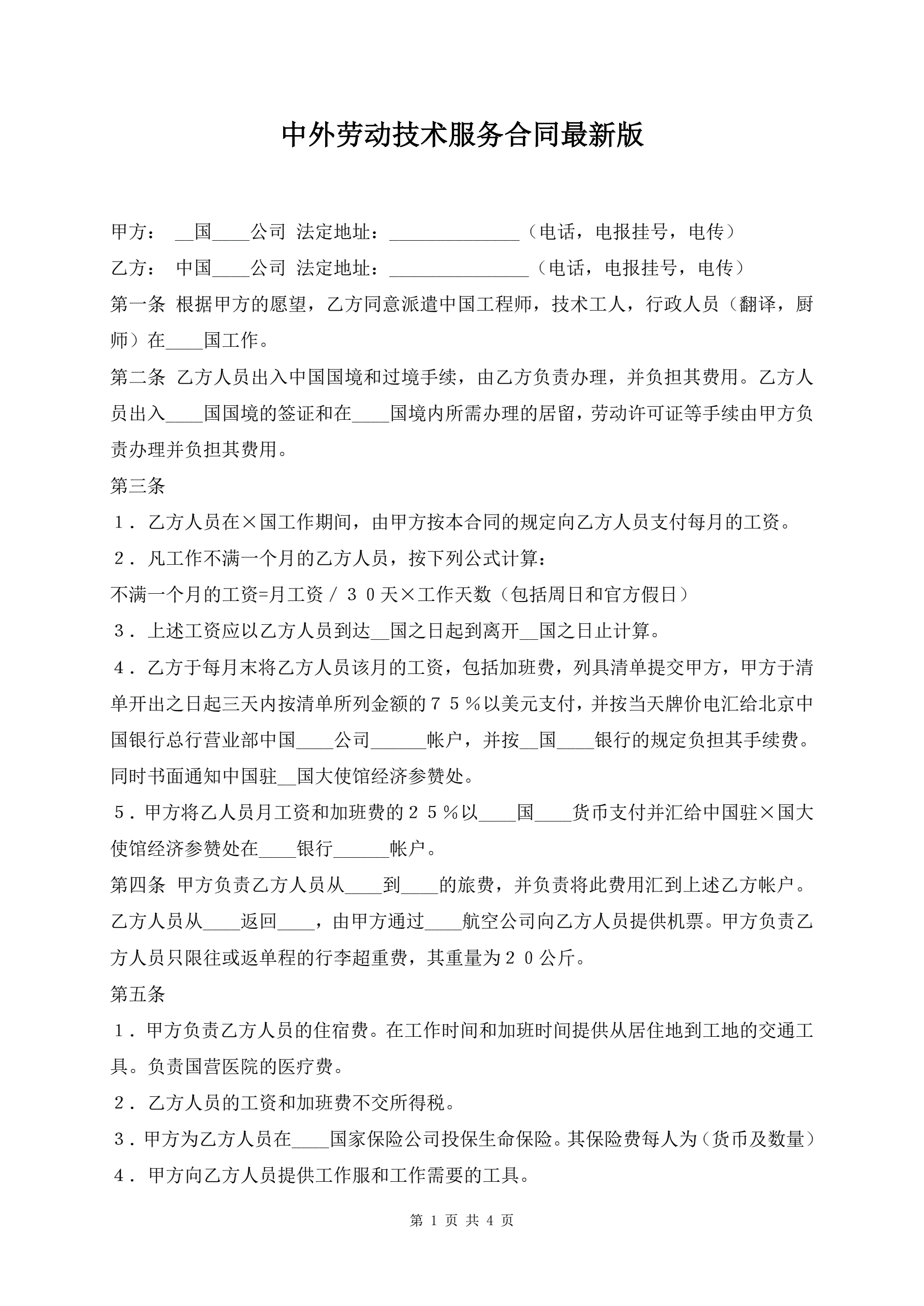 >中外劳动技术服务合同最新版