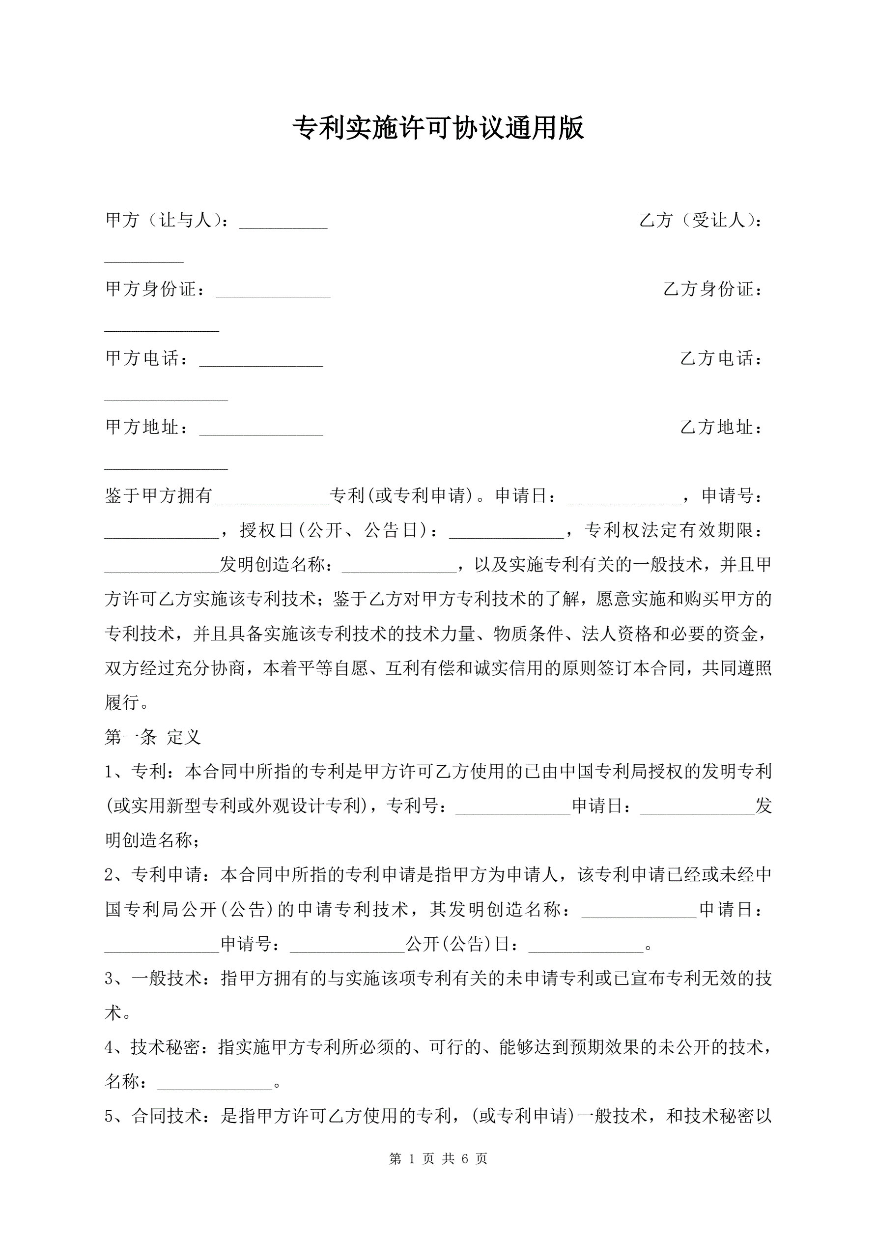 专利实施许可协议通用版