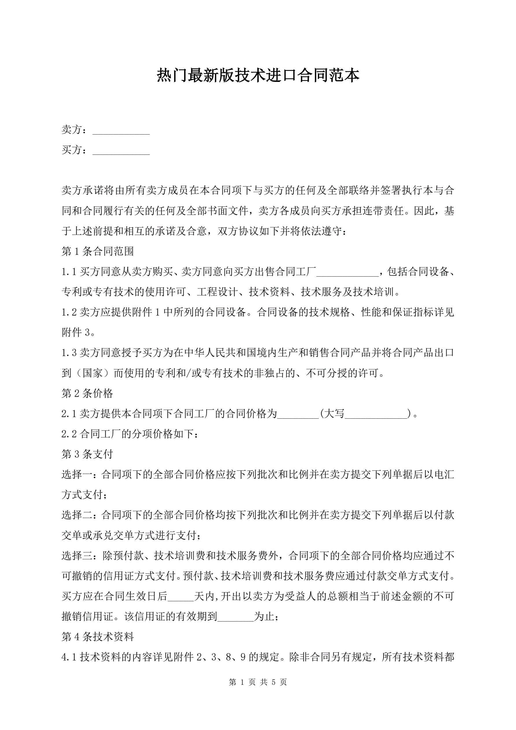 热门最新版技术进口合同范本