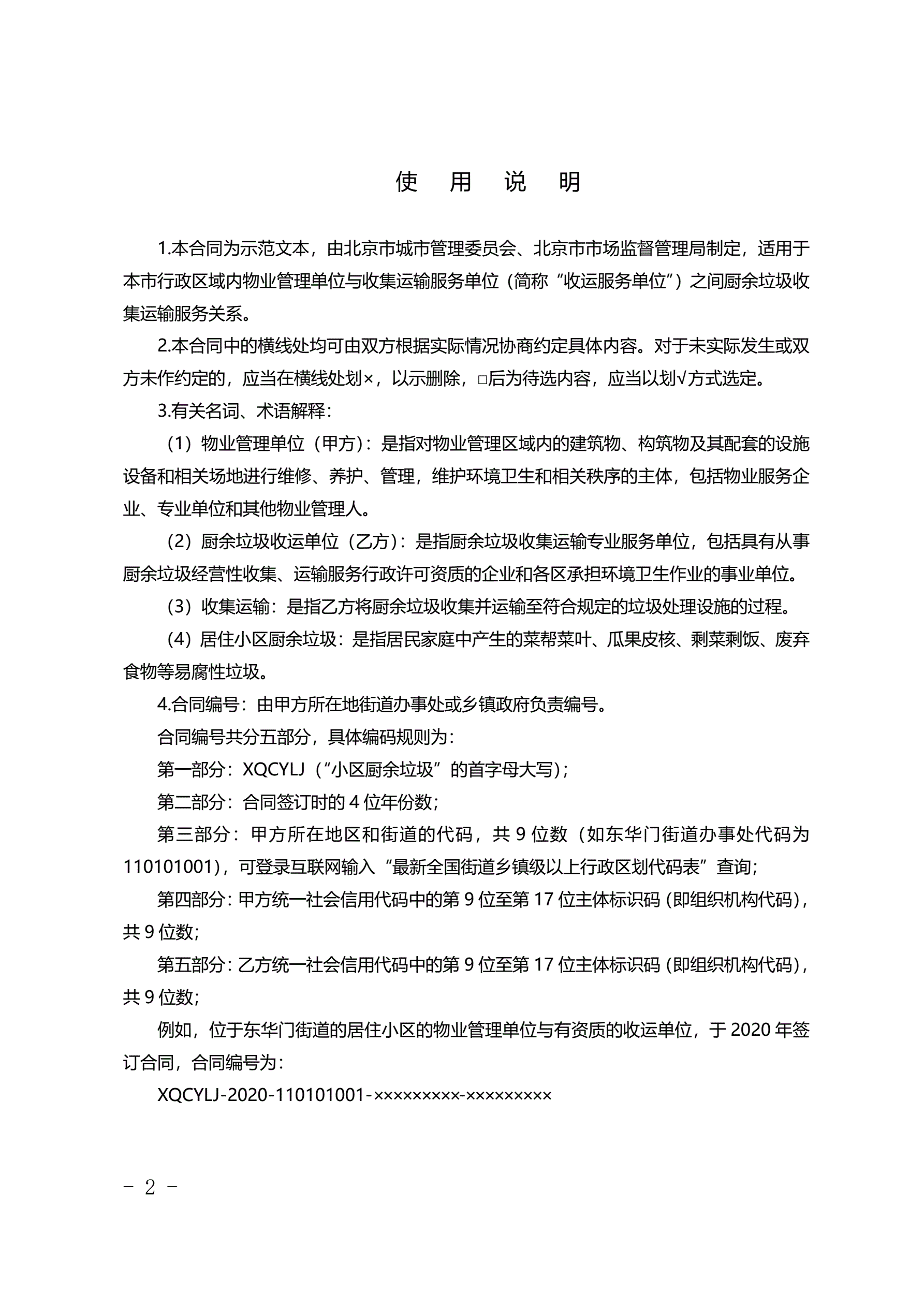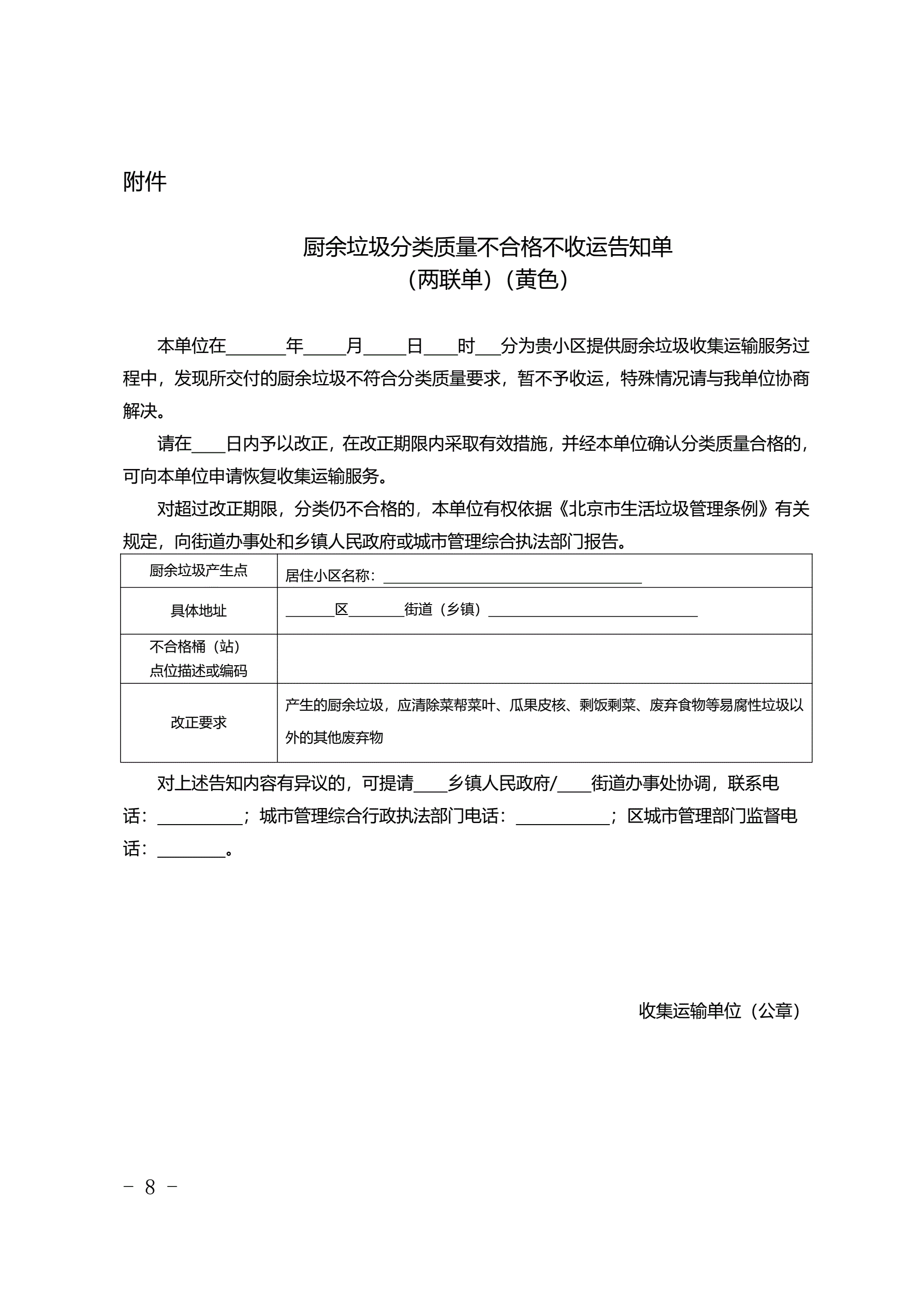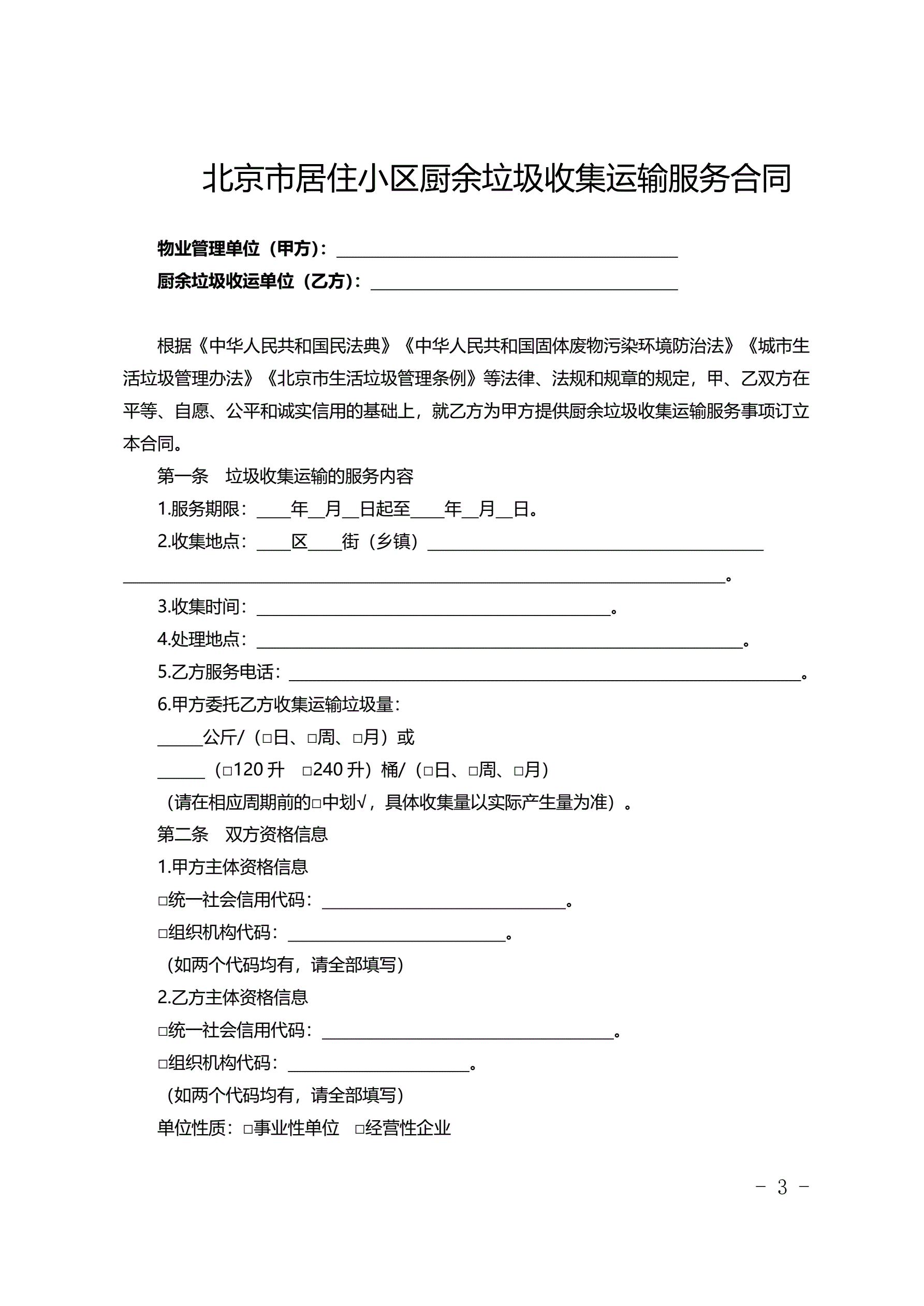 北京市居住小区厨余垃圾收集运输服务合同