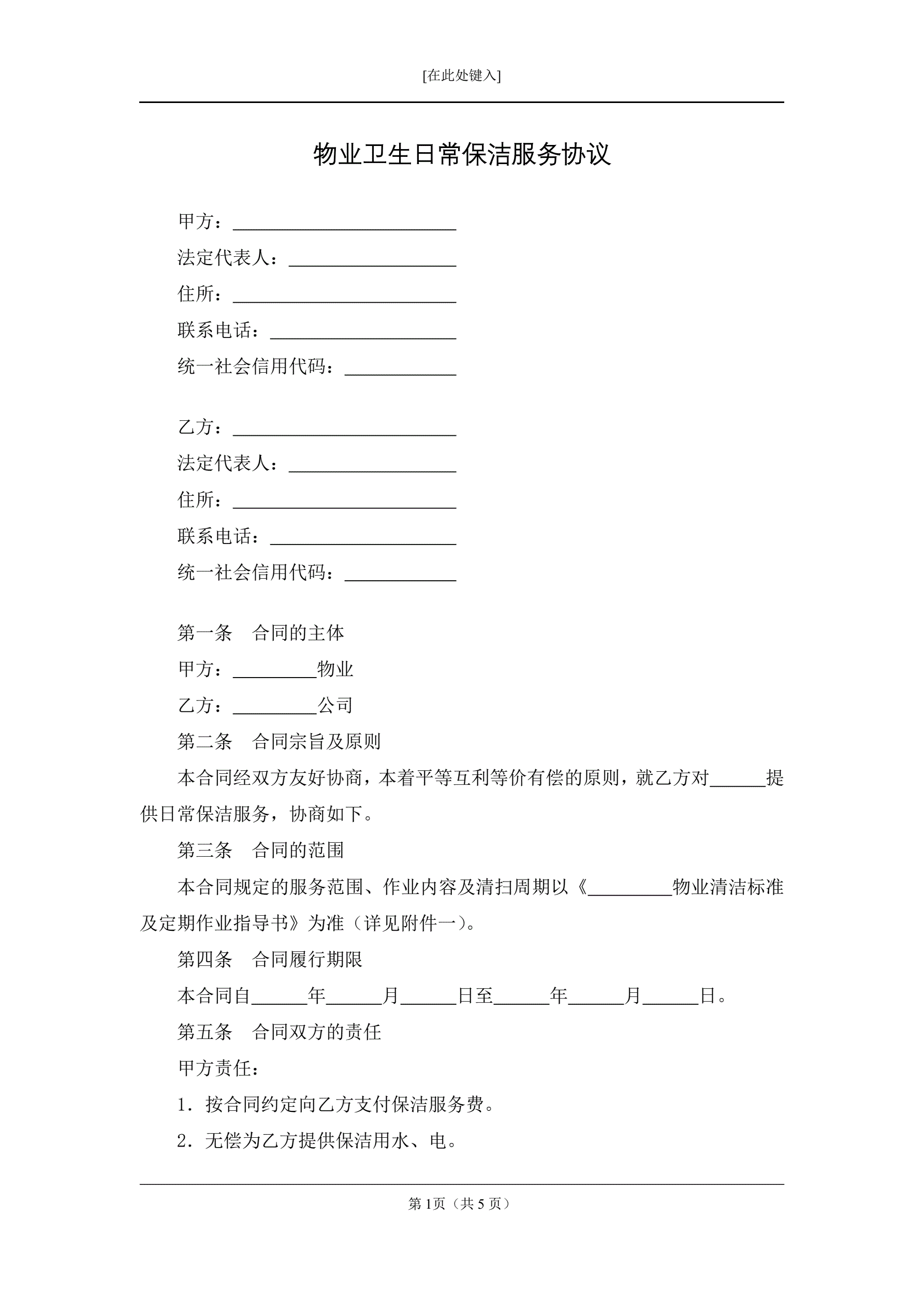 物业卫生日常保洁服务协议