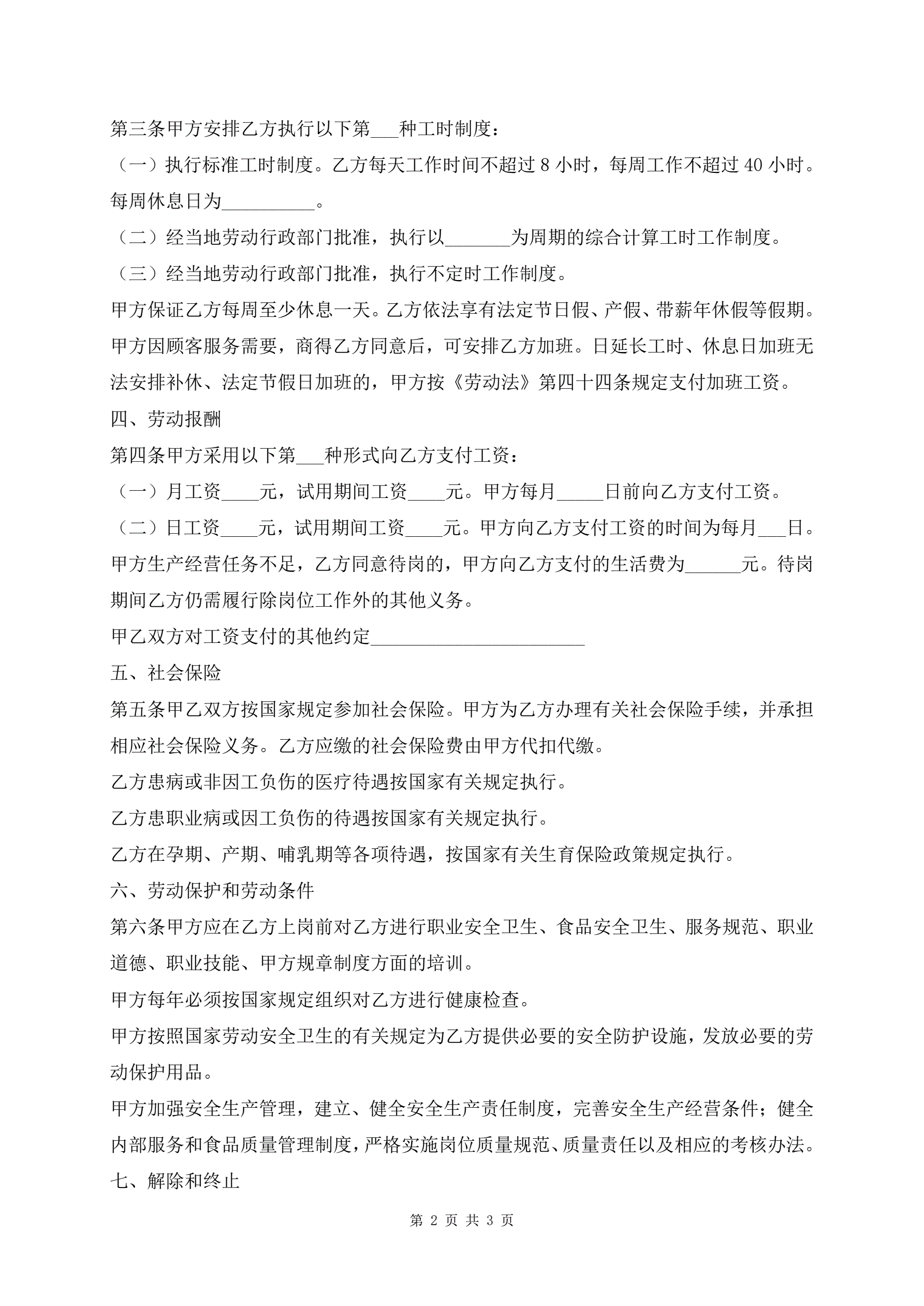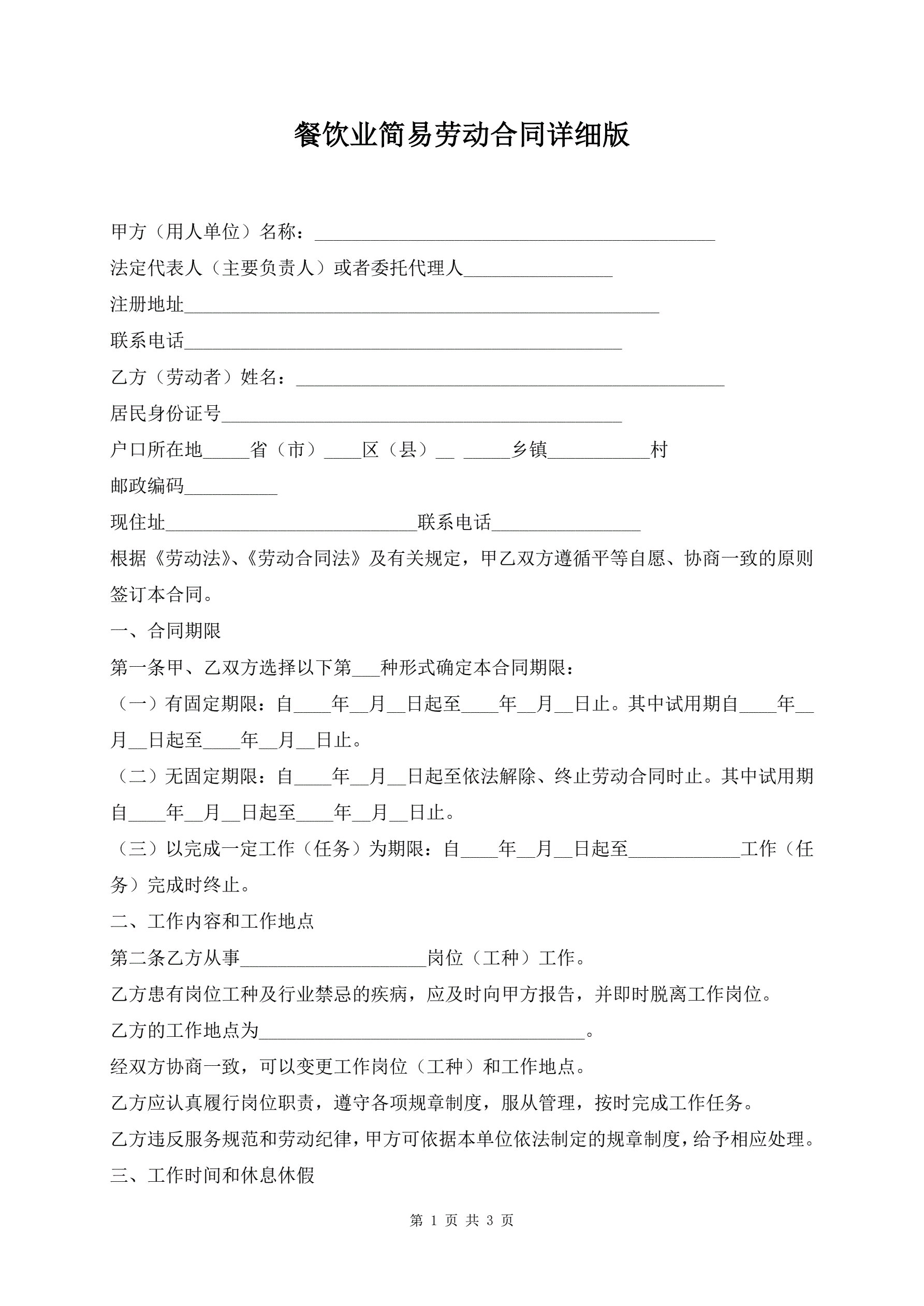 餐饮业简易劳动合同详细版