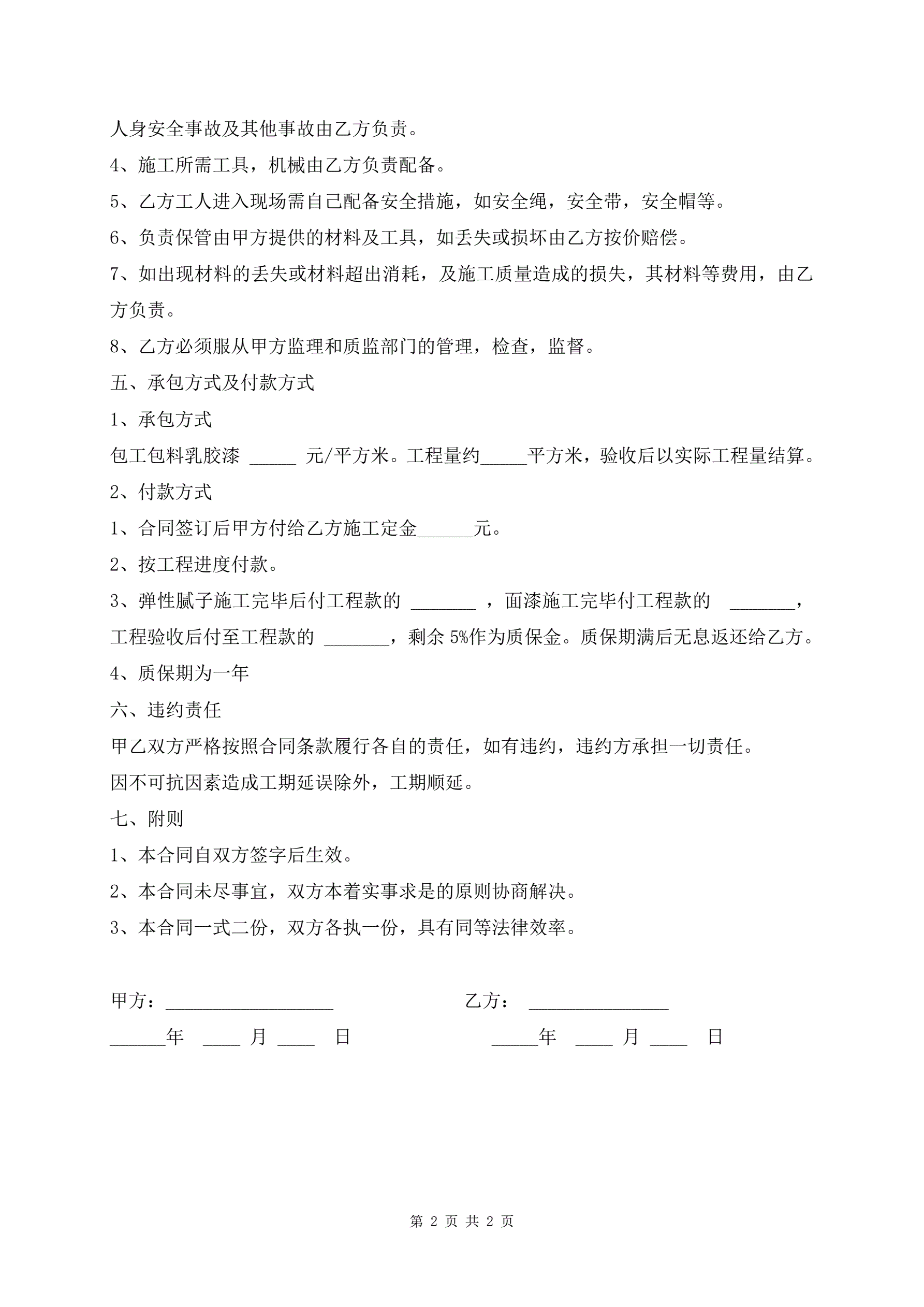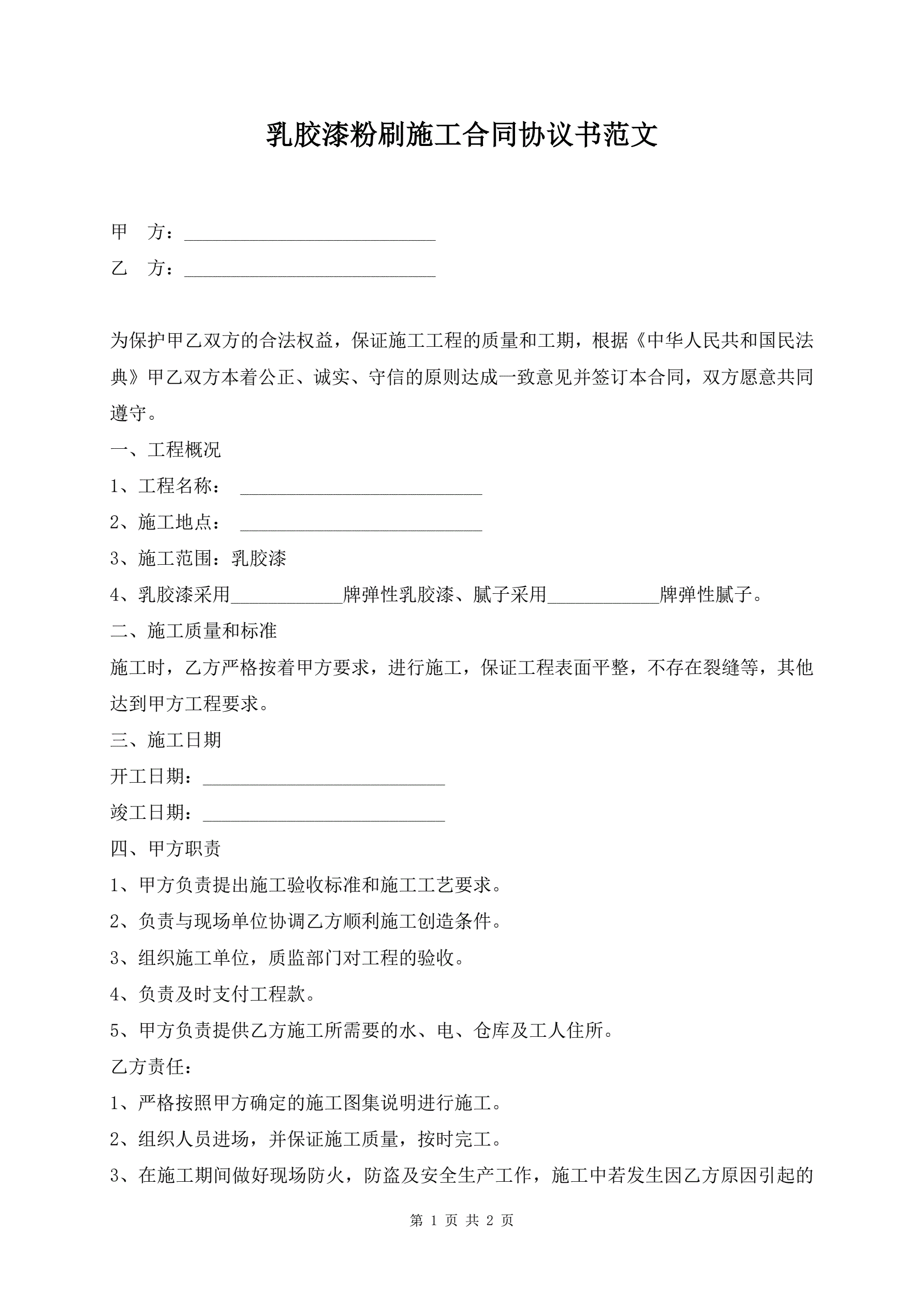 >乳胶漆粉刷施工合同协议书范文