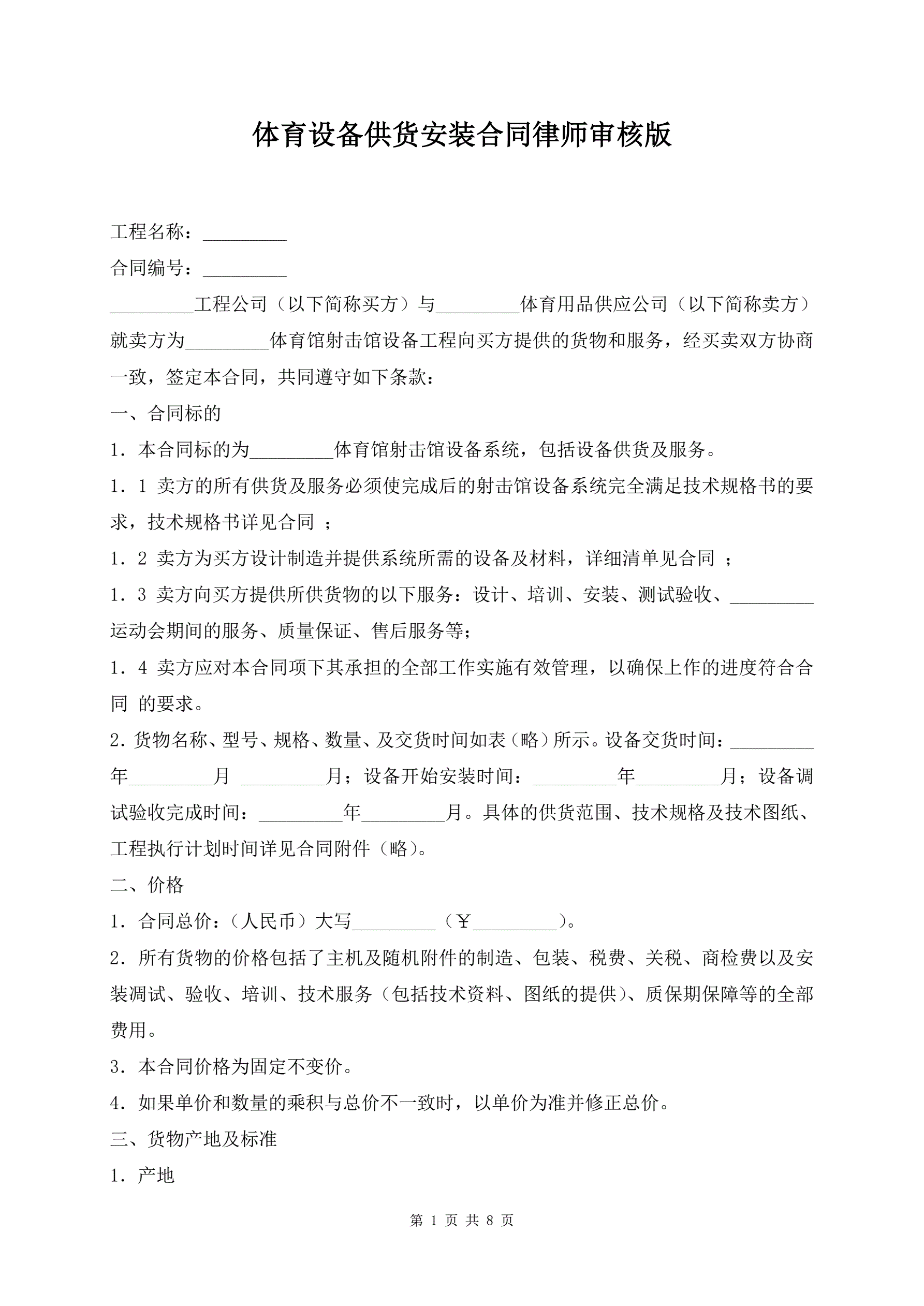 >体育设备供货安装合同律师审核版