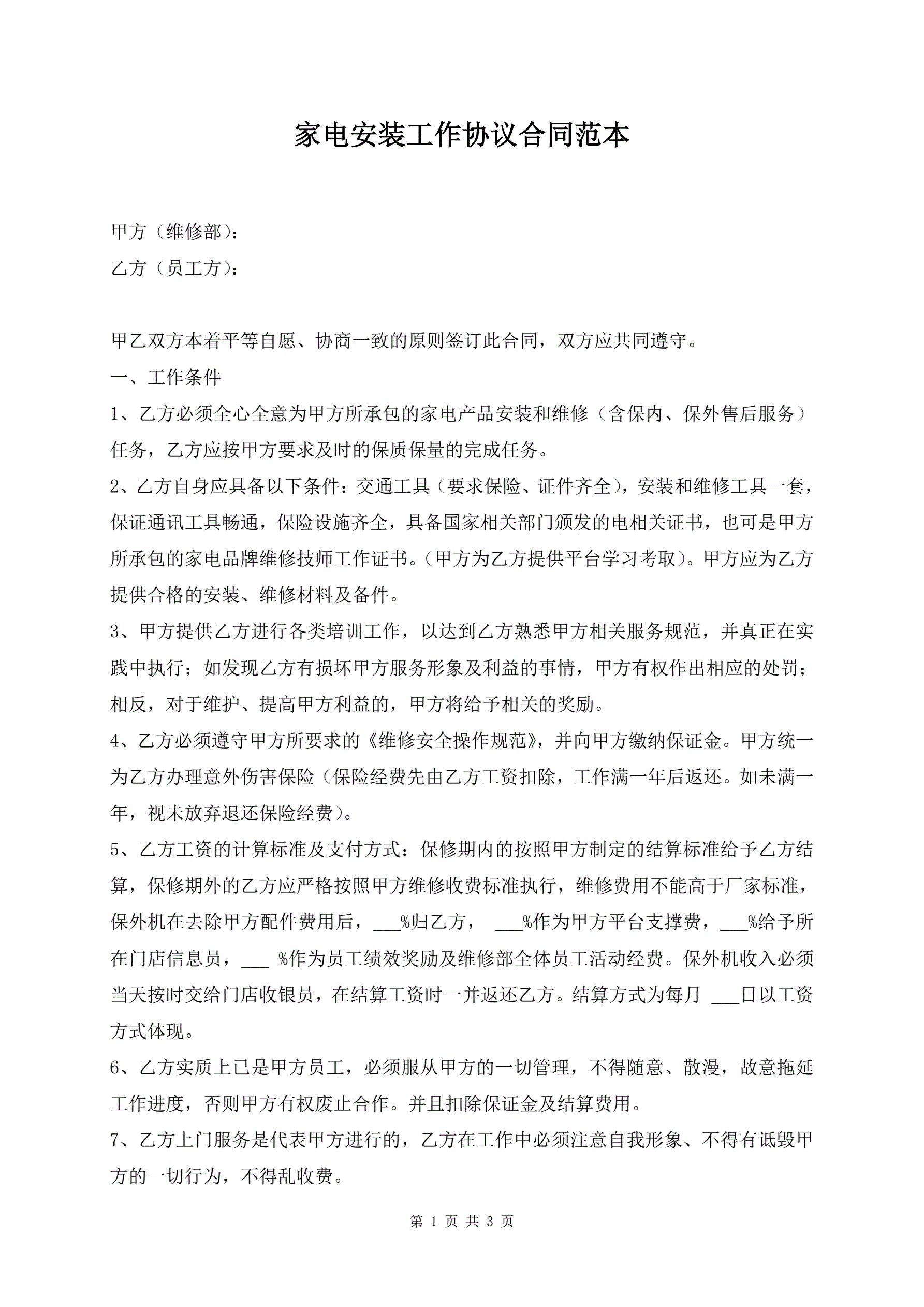 >家电安装工作协议合同范本