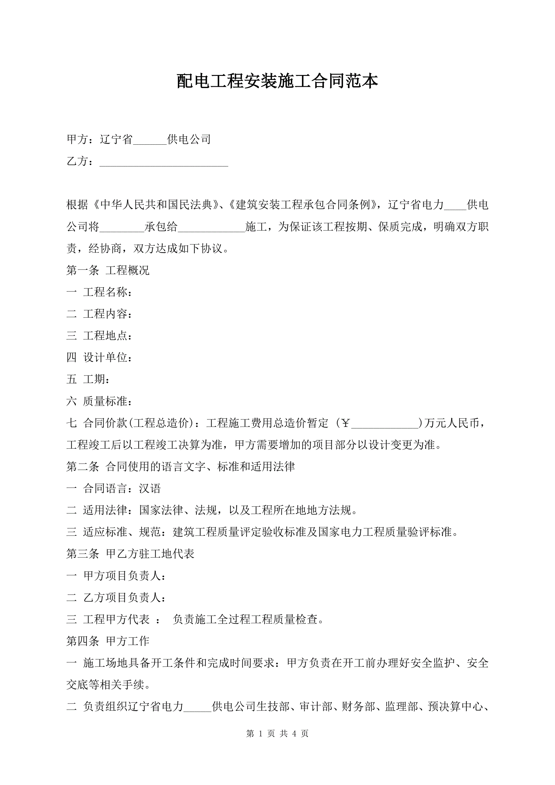 >配电工程安装施工合同范本