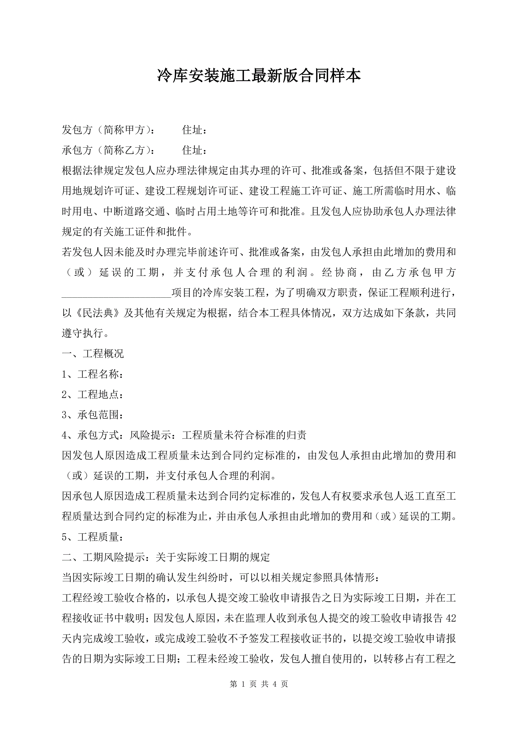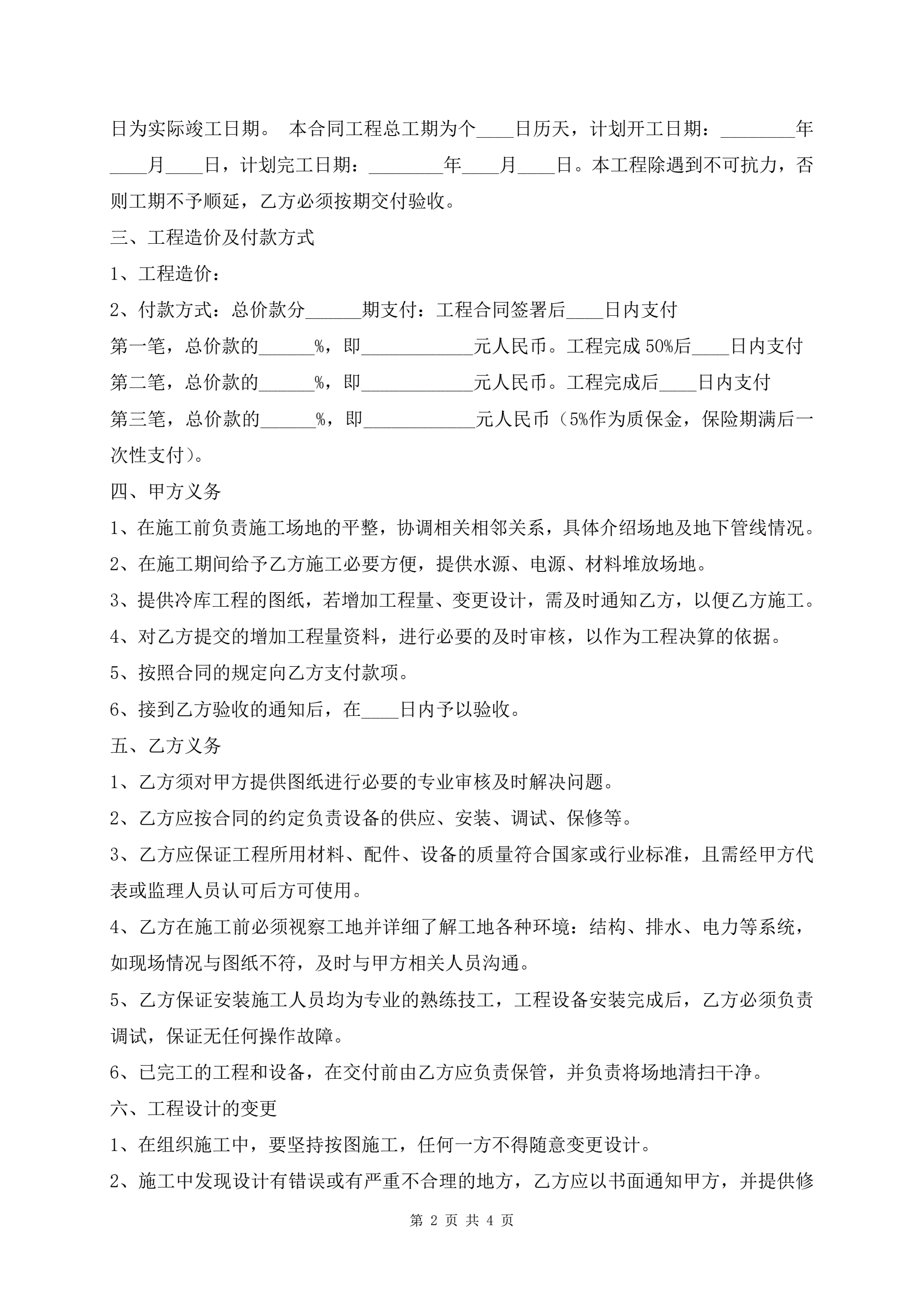 冷库安装施工最新版合同样本