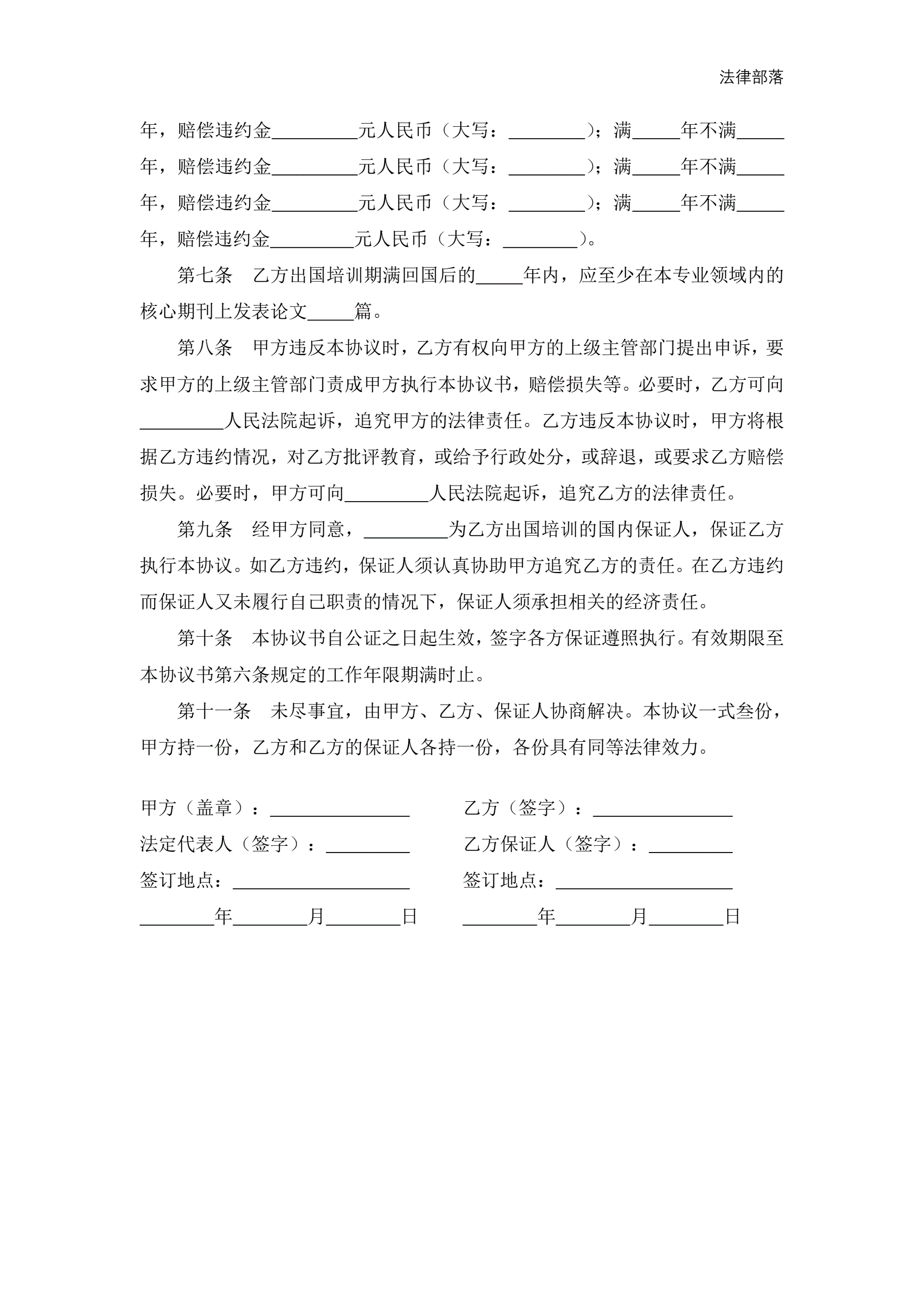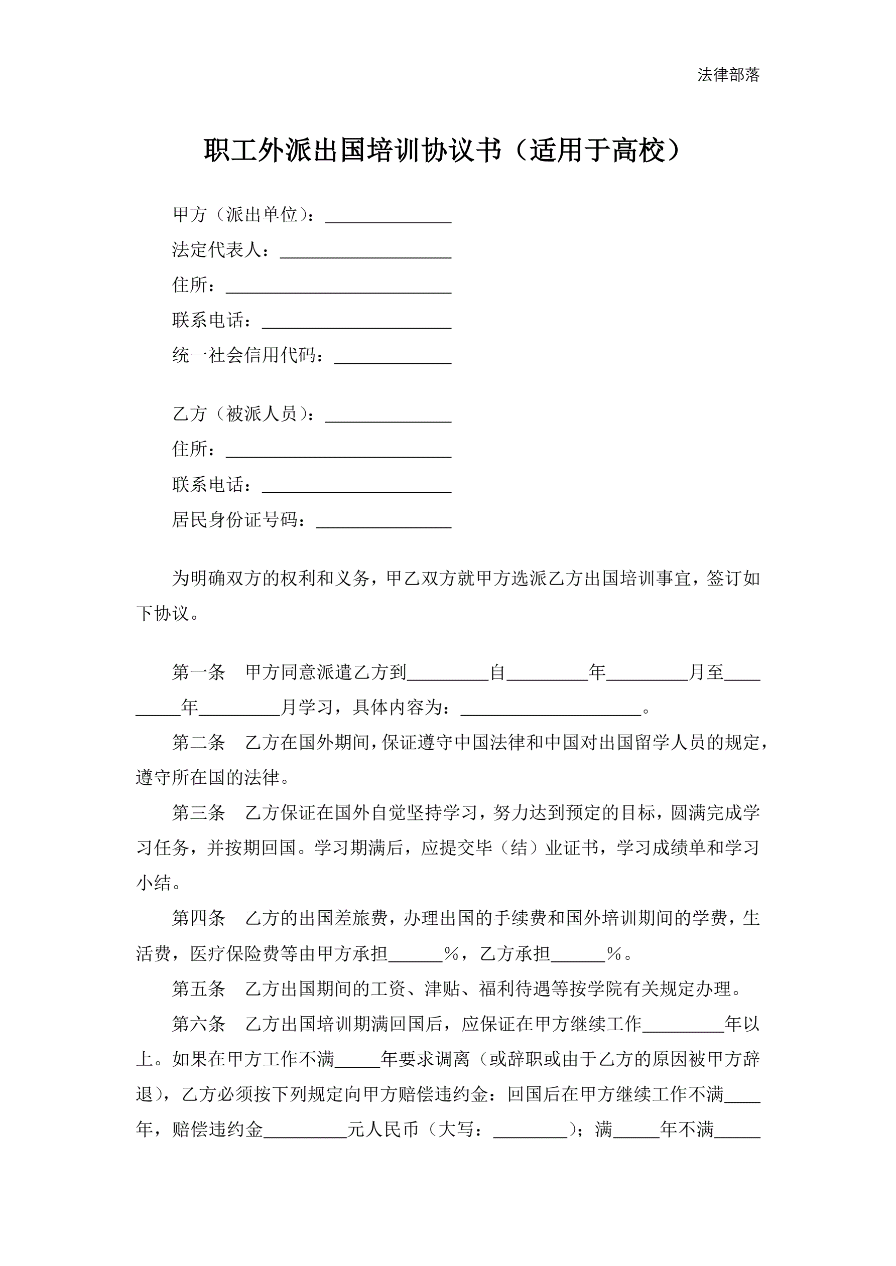 >职工外派出国培训协议书(适用于高校)
