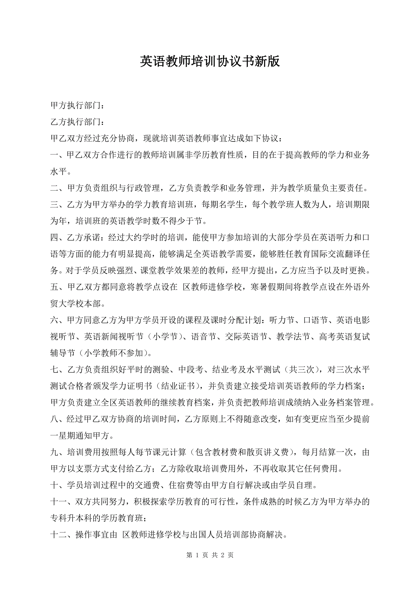 英语教师培训协议书新版