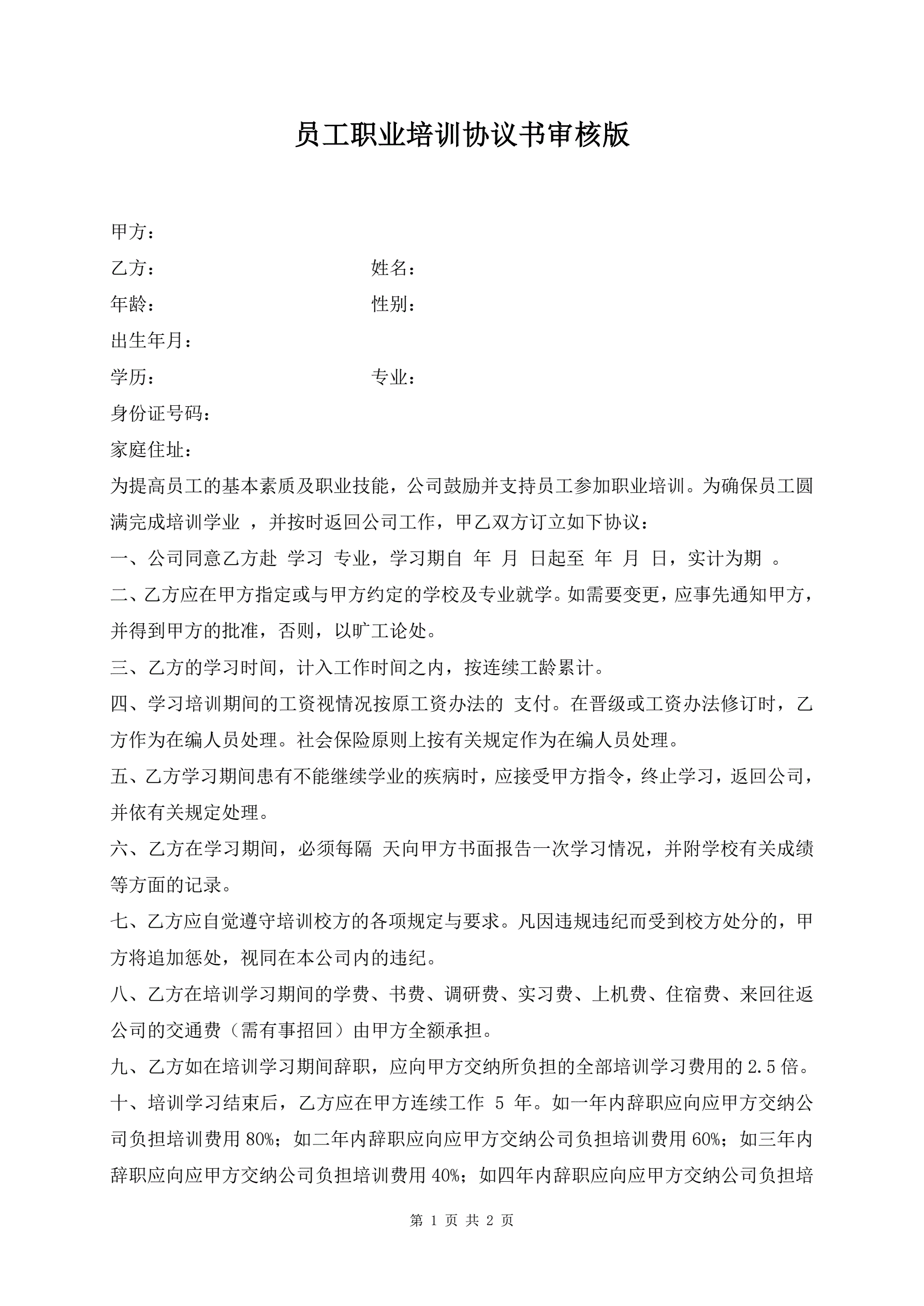 员工职业培训协议书审核版