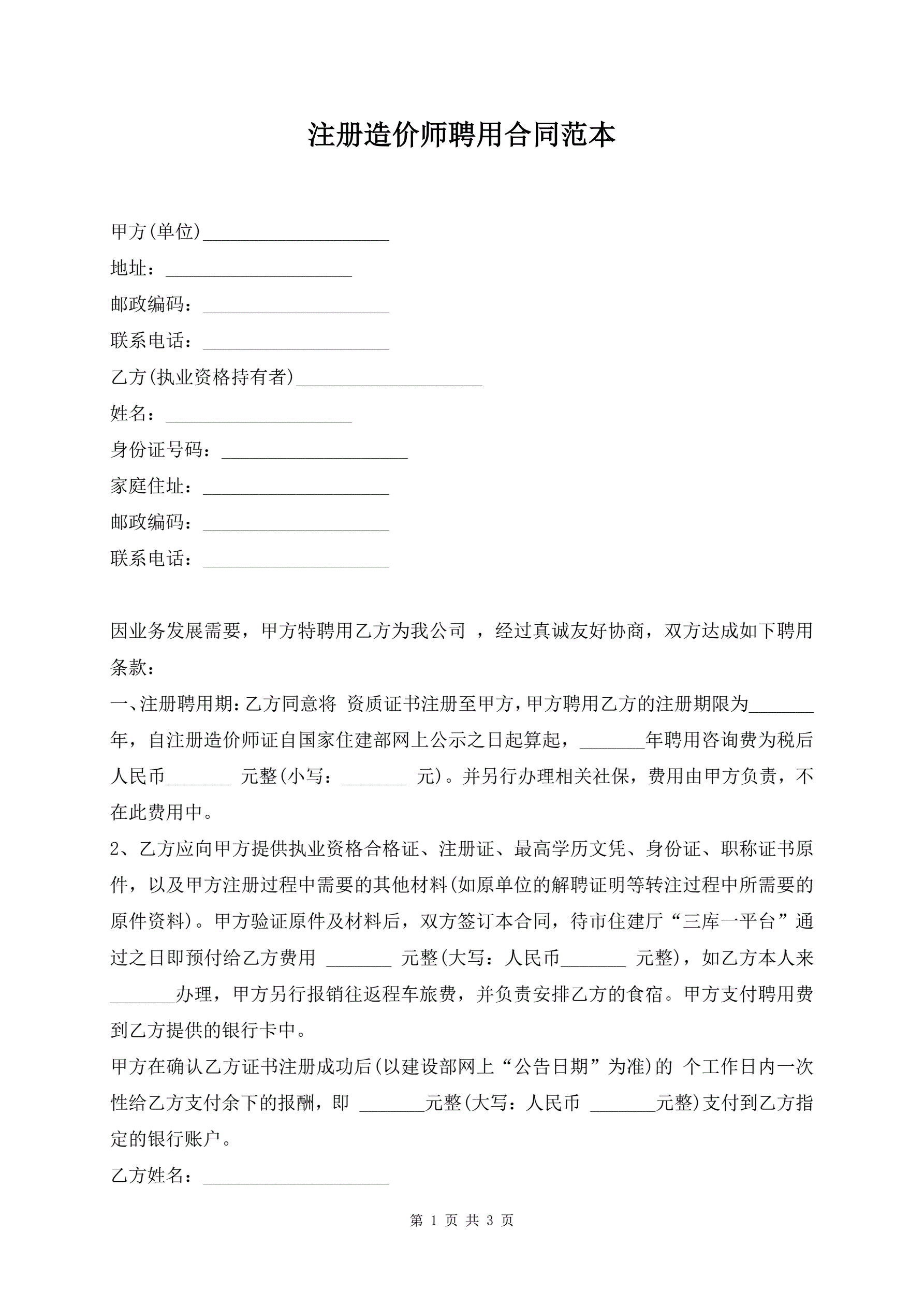 注册造价师聘用合同范本