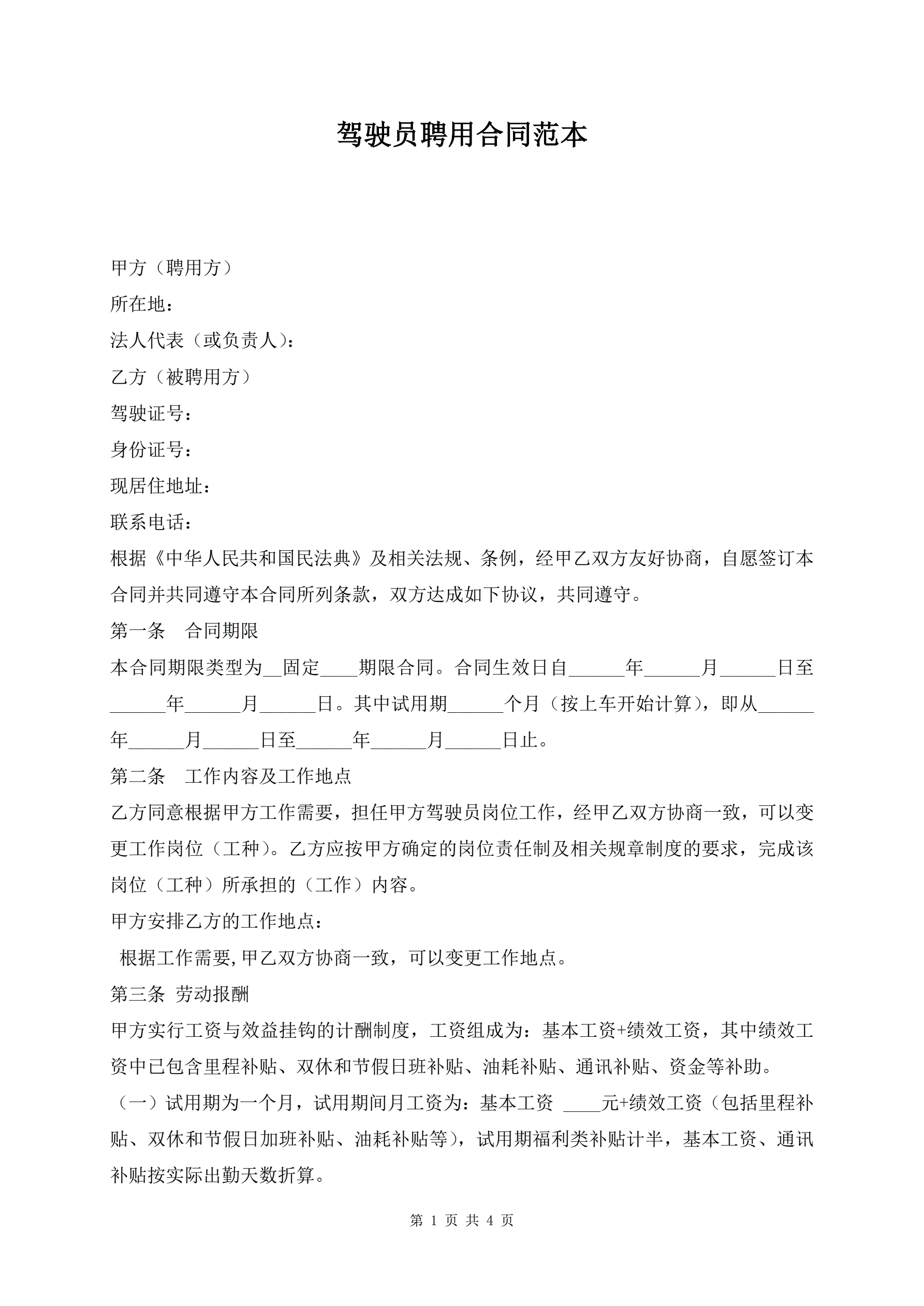 驾驶员聘用合同范本