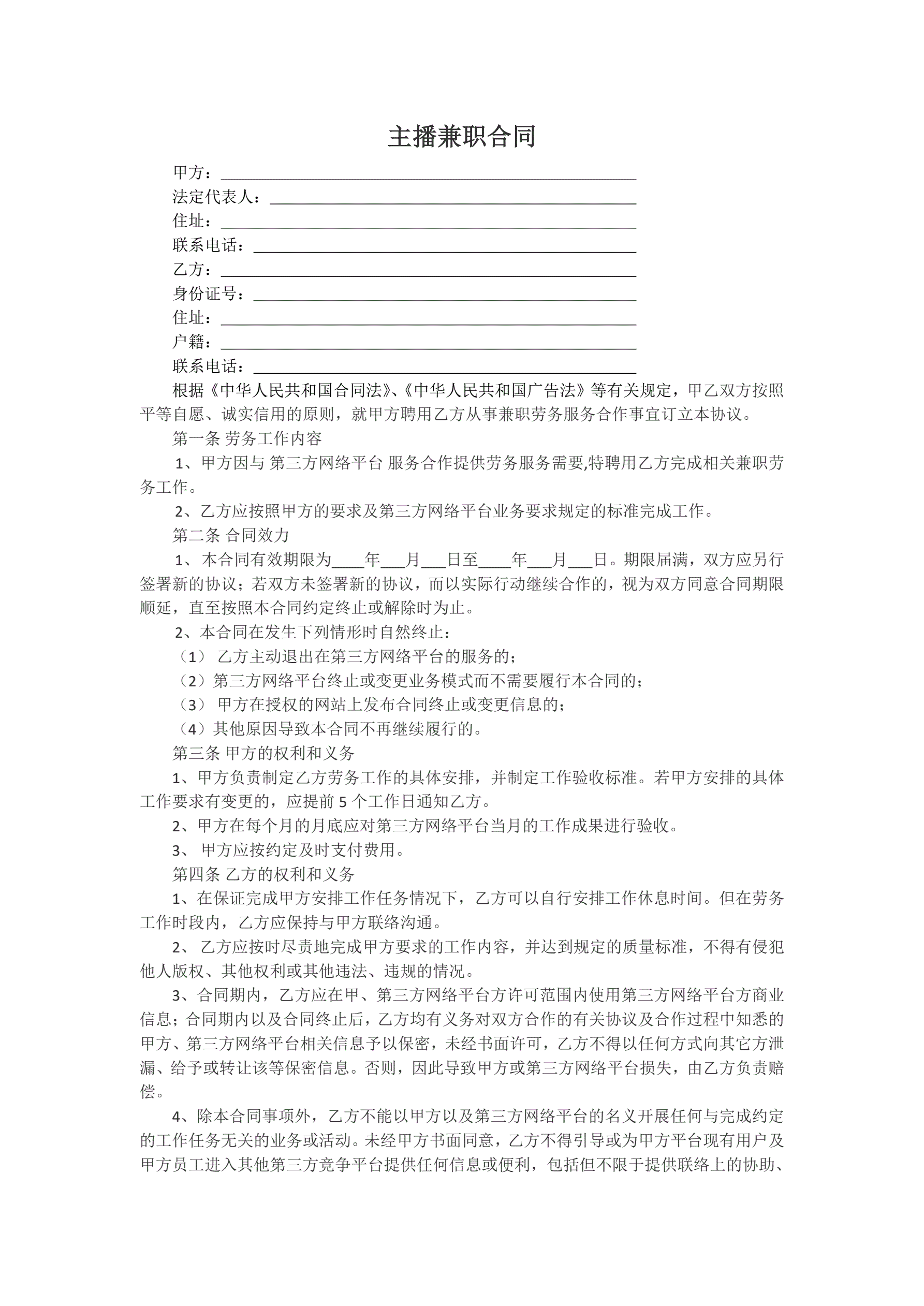 >主播兼职合同