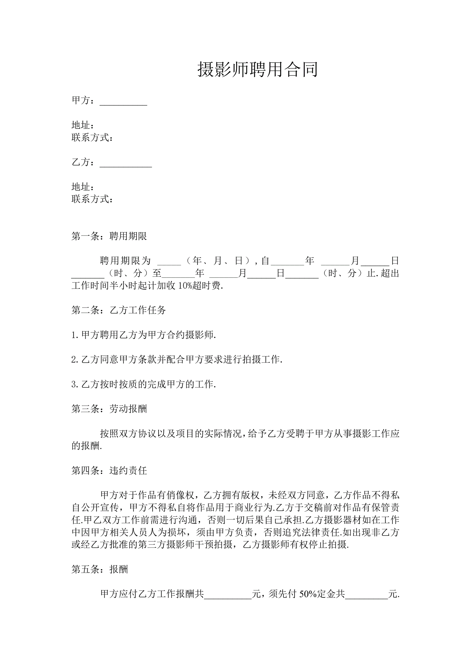 摄影师聘用合同