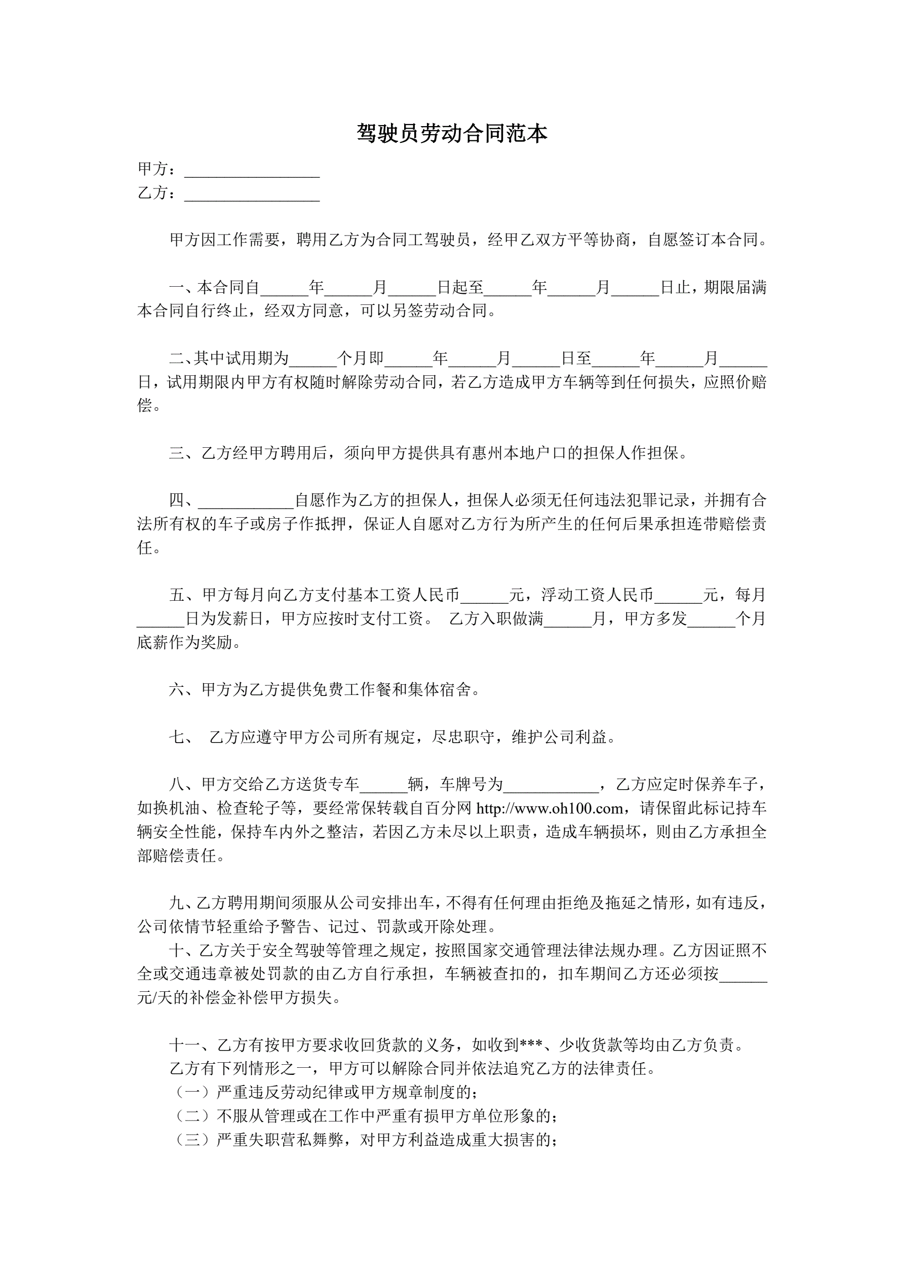 驾驶员劳动合同范本