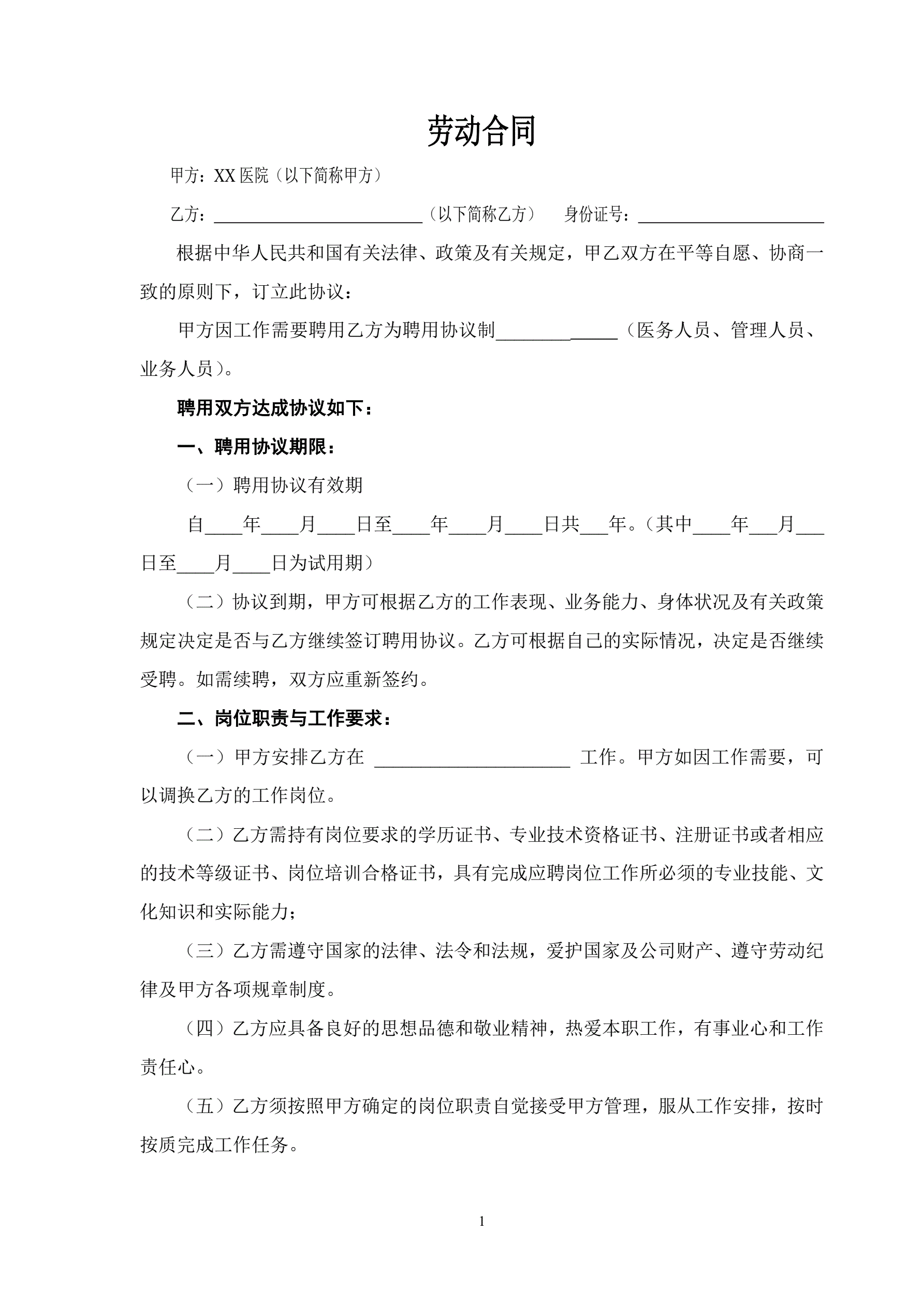 >民营医院职工劳动合同
