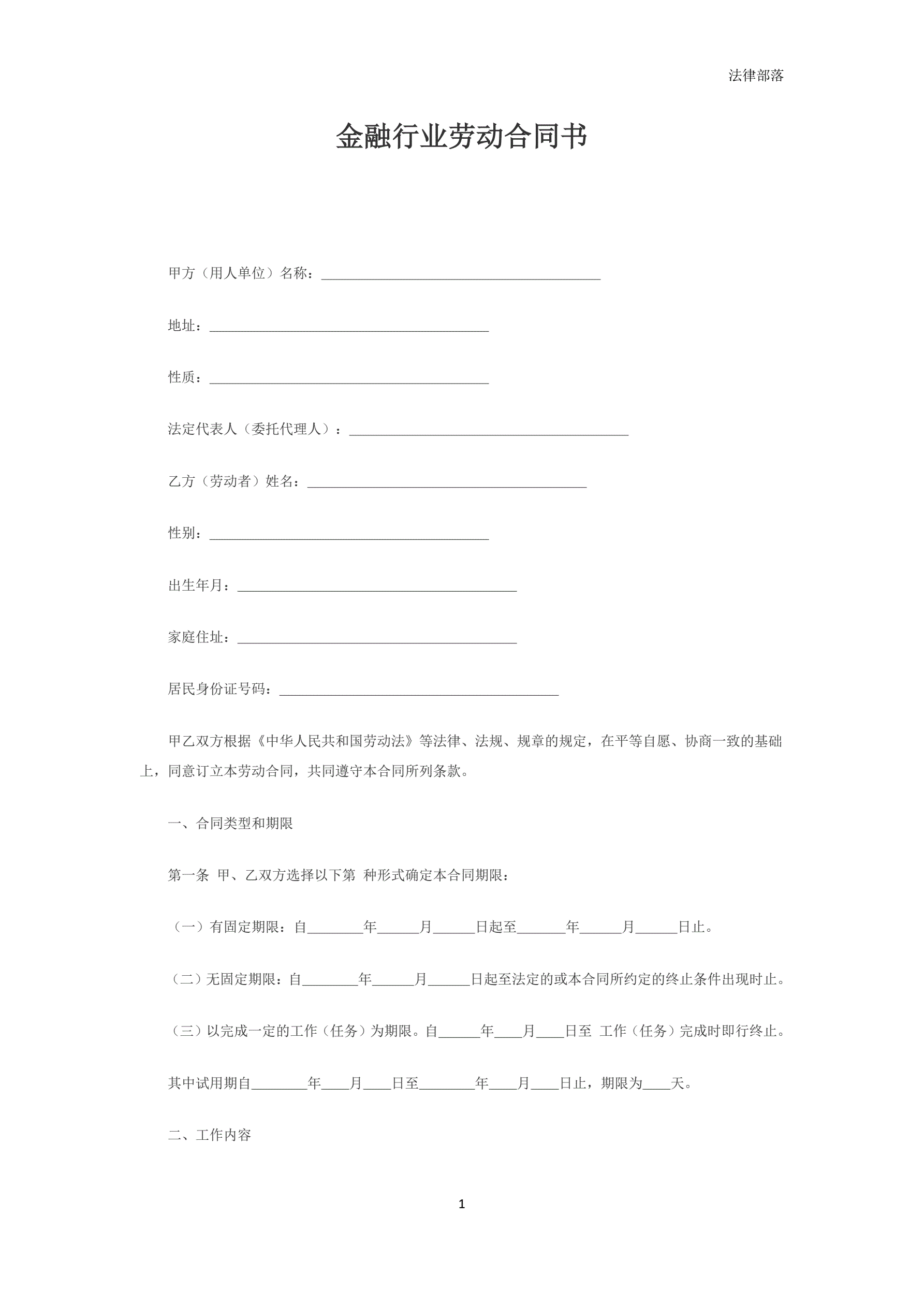 金融企业劳动合同书范本