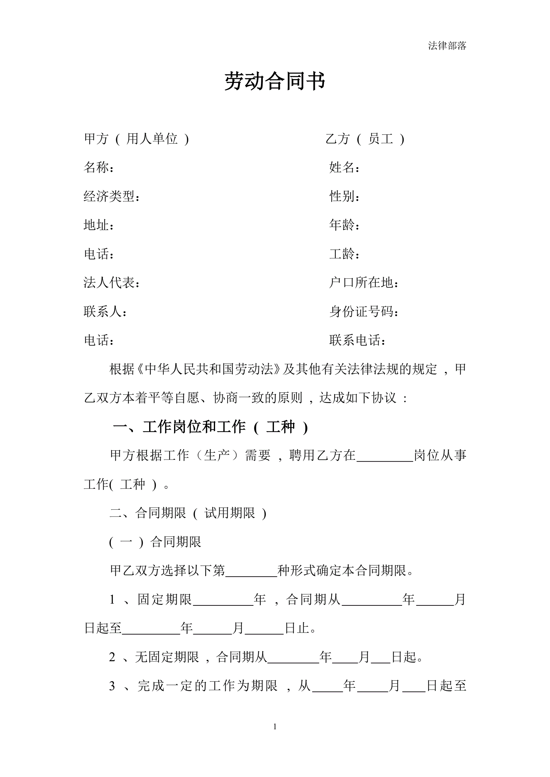 劳动合同书简版