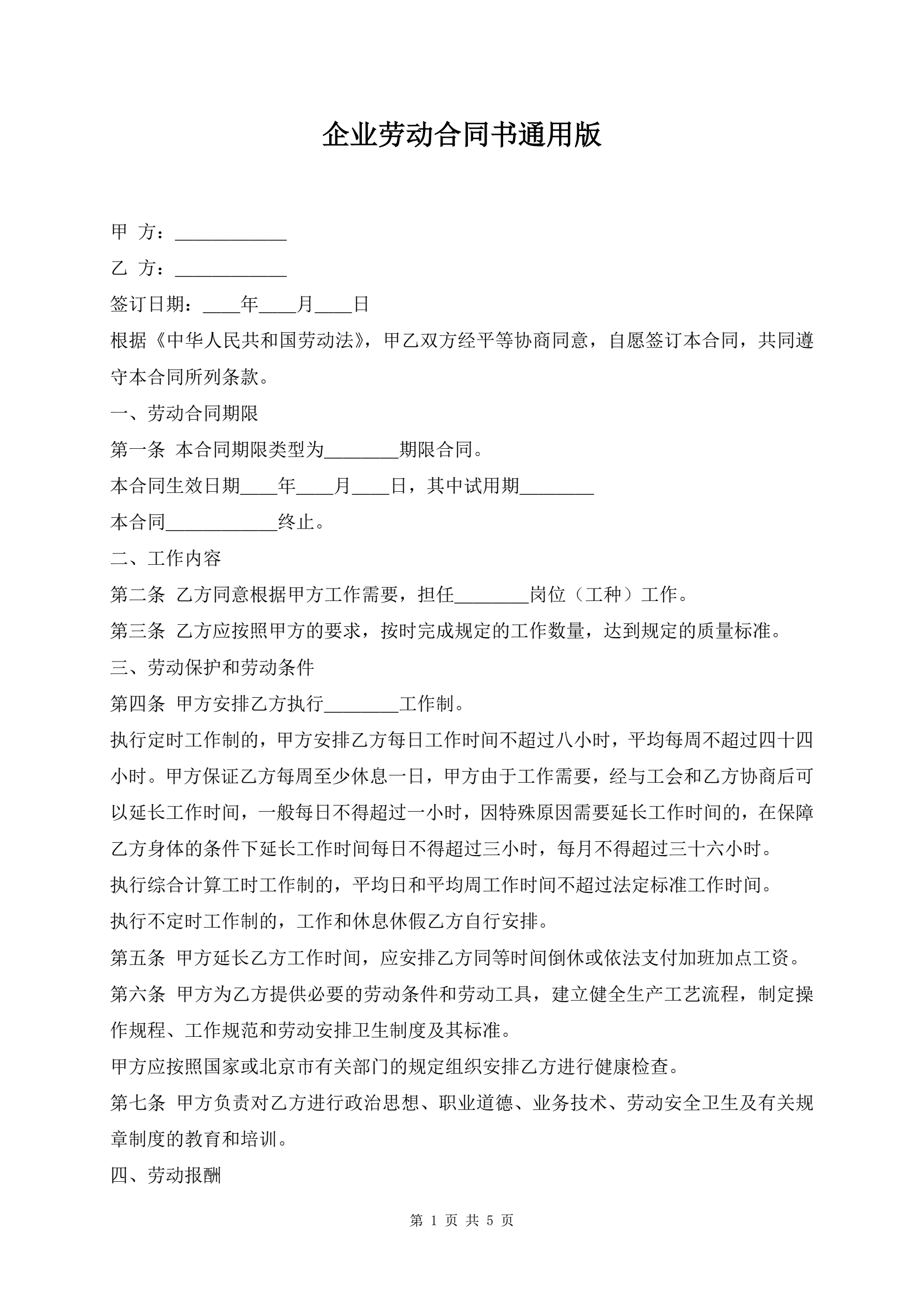 企业劳动合同书通用版