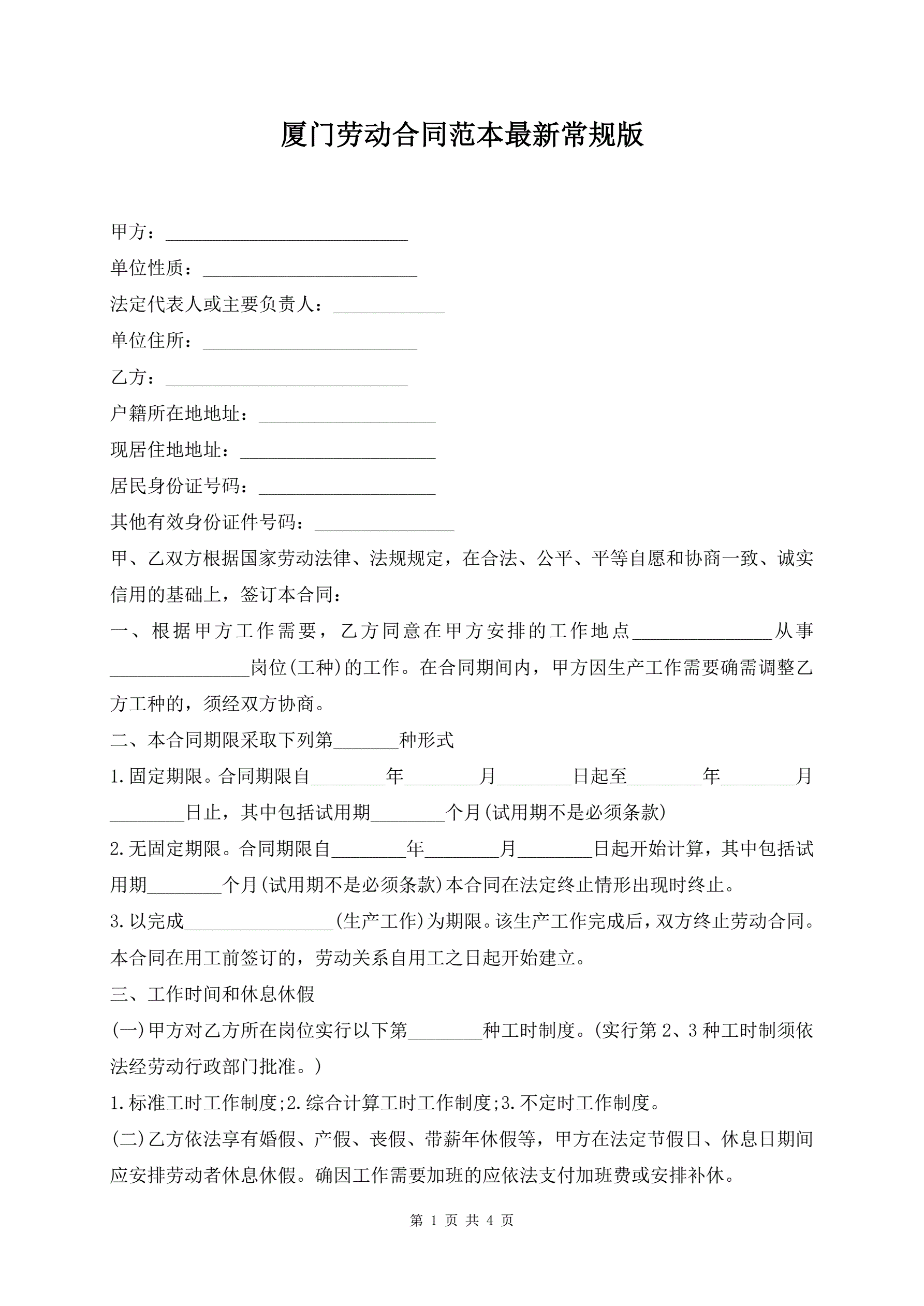 厦门劳动合同范本最新常规版