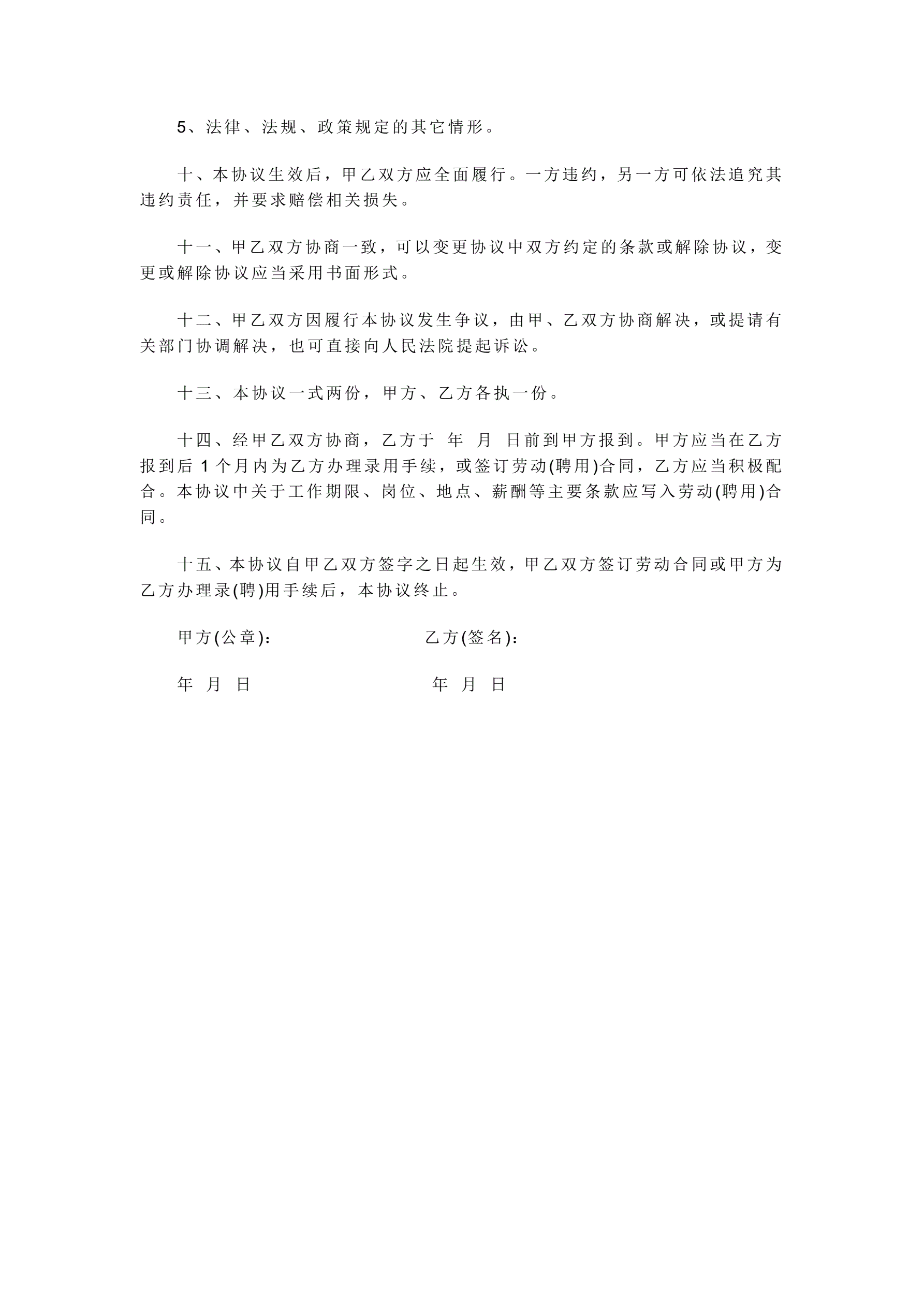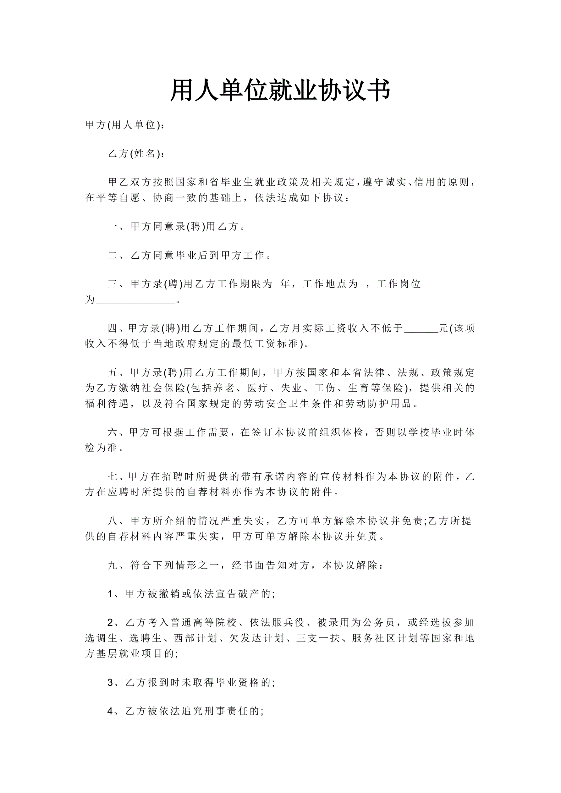 >用人单位就业协议书