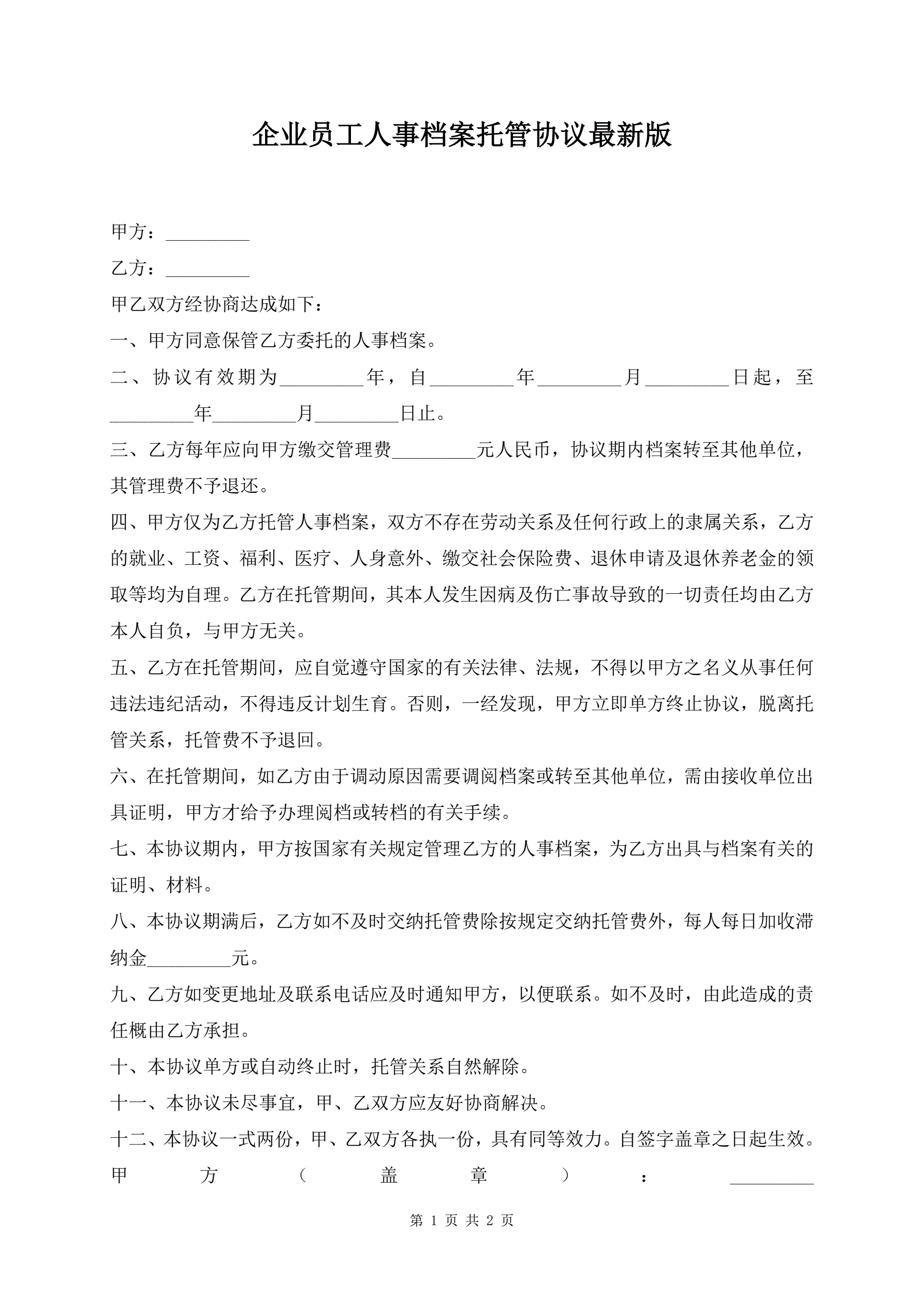 >企业员工人事档案托管协议最新版