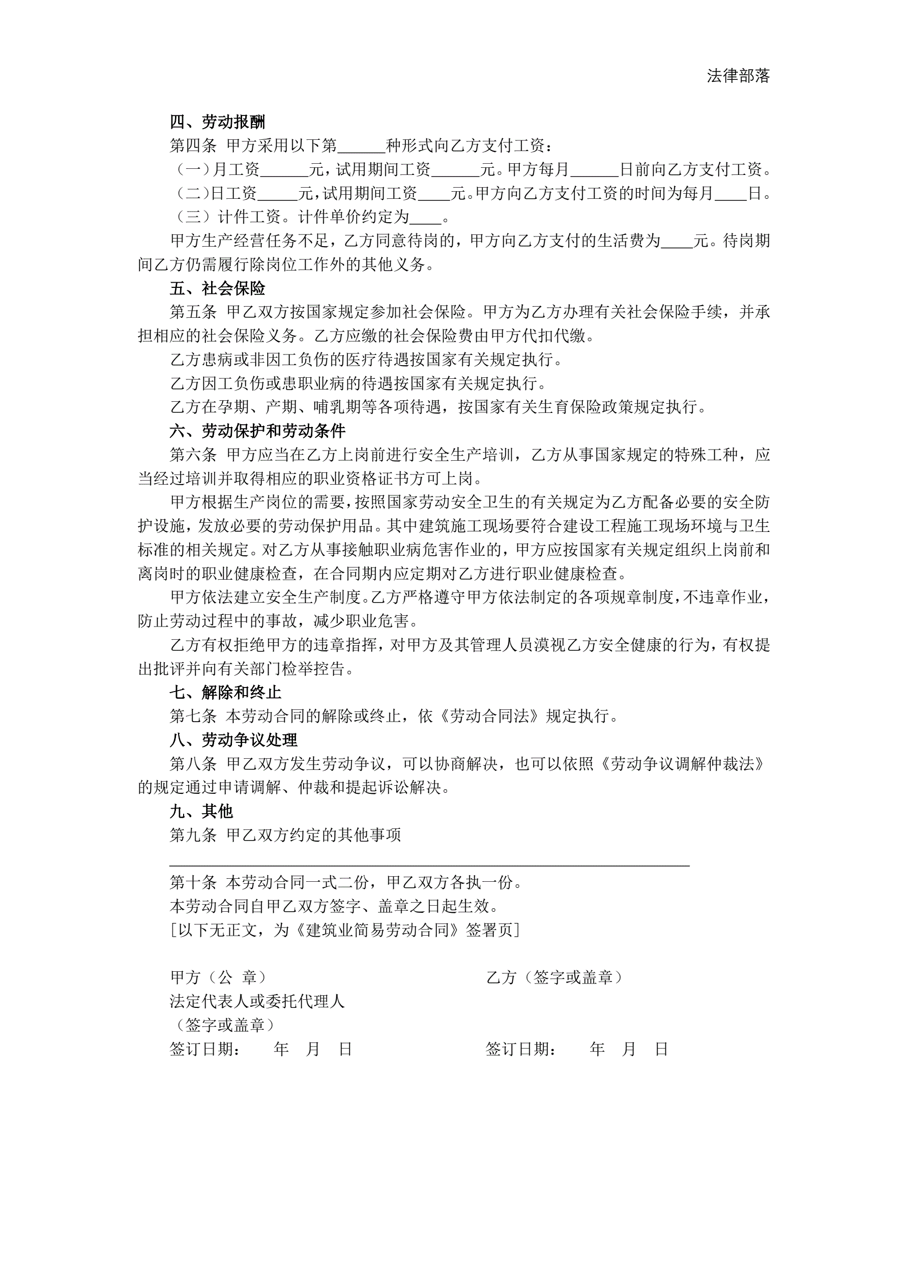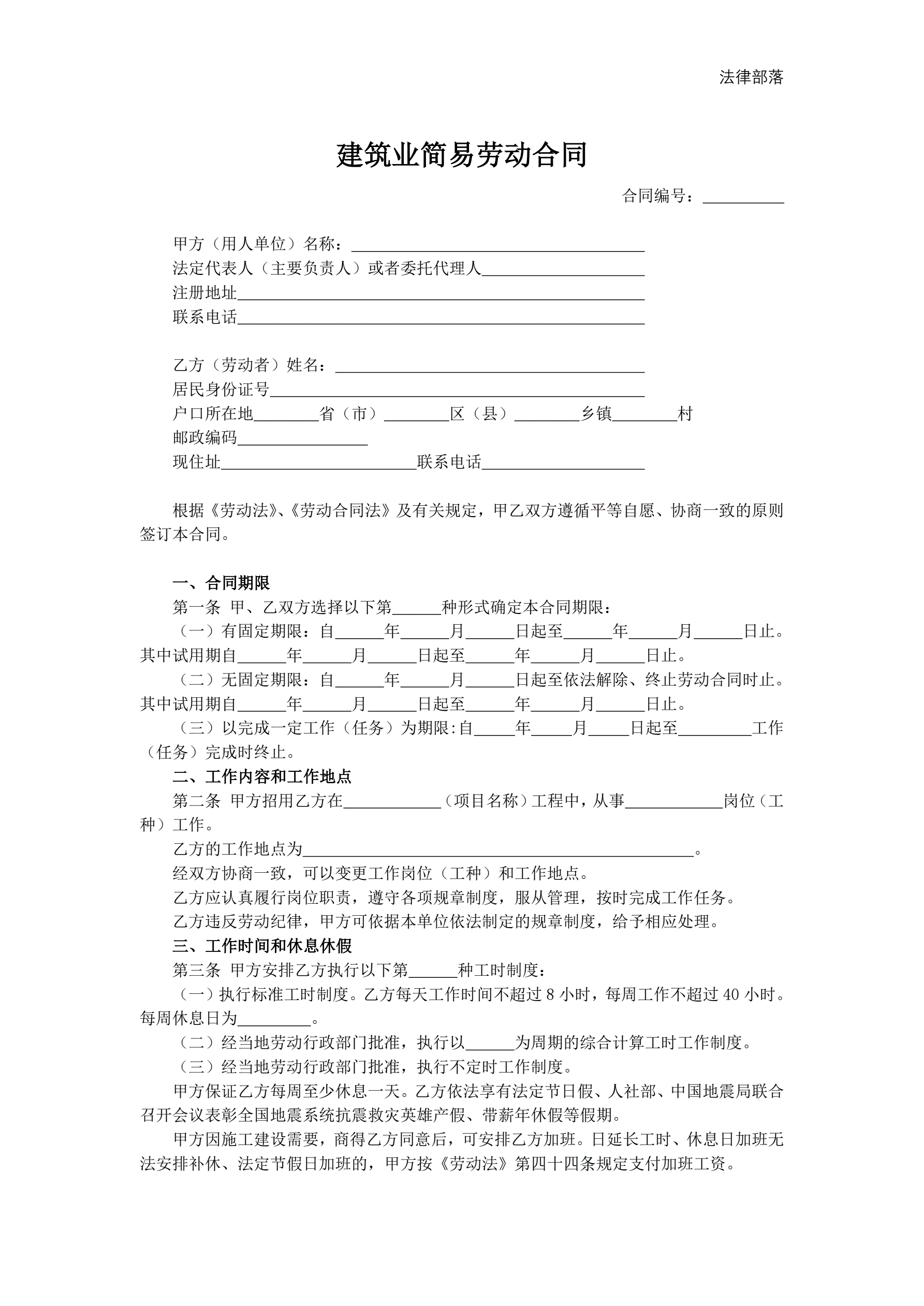 建筑业简易劳动合同