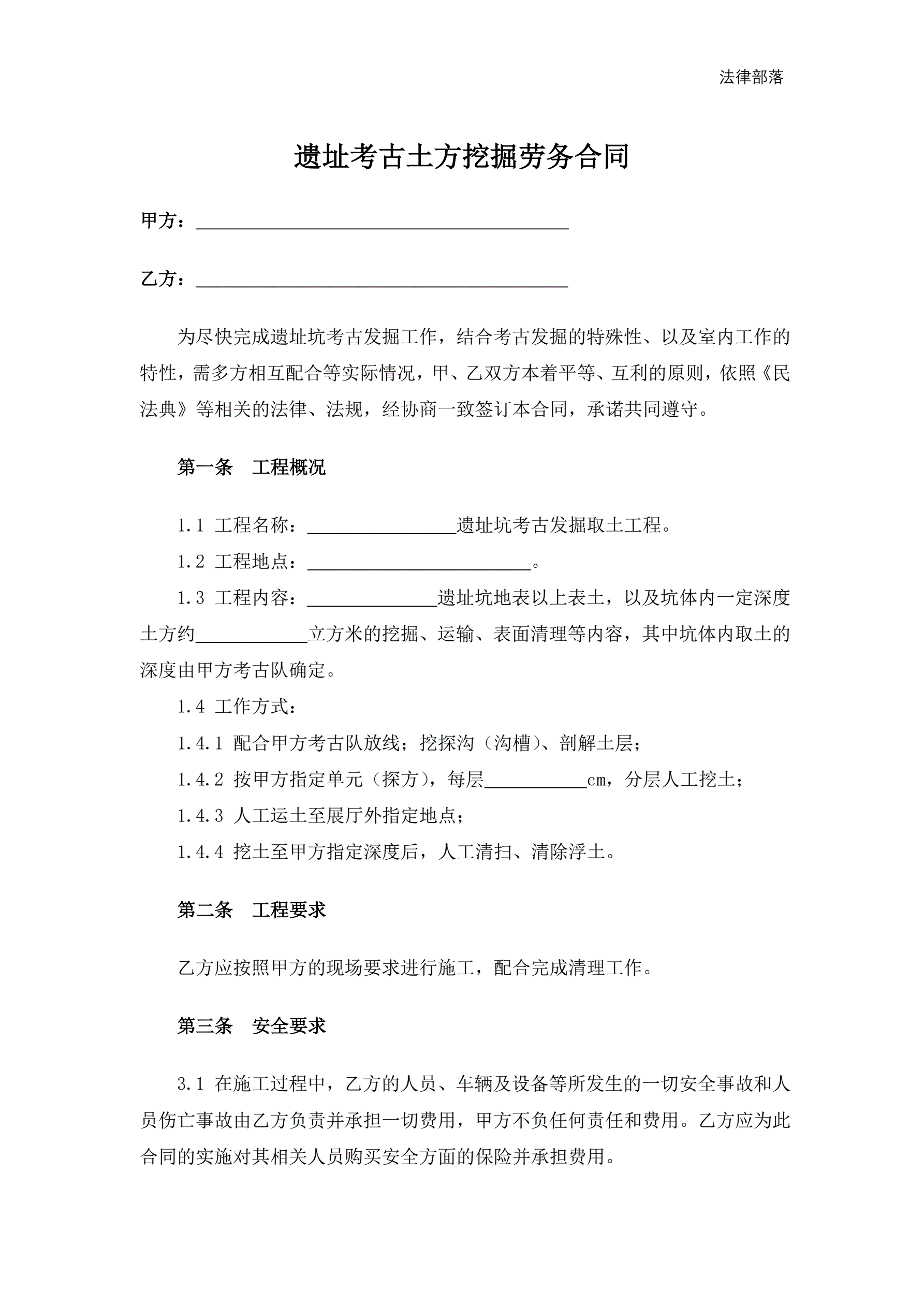 遗址考古土方挖掘劳务合同