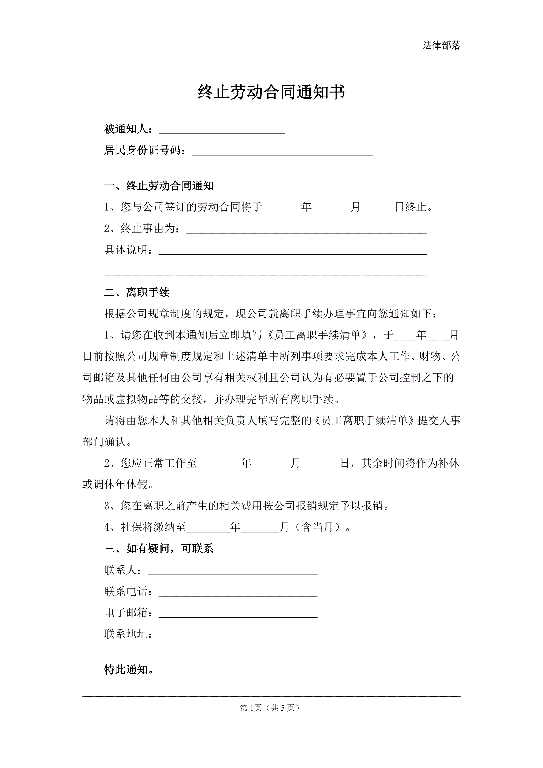 >终止劳动合同通知书
