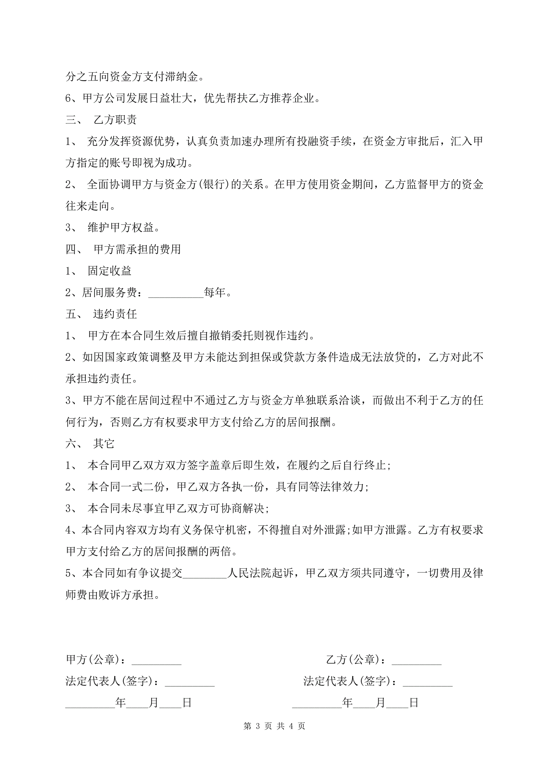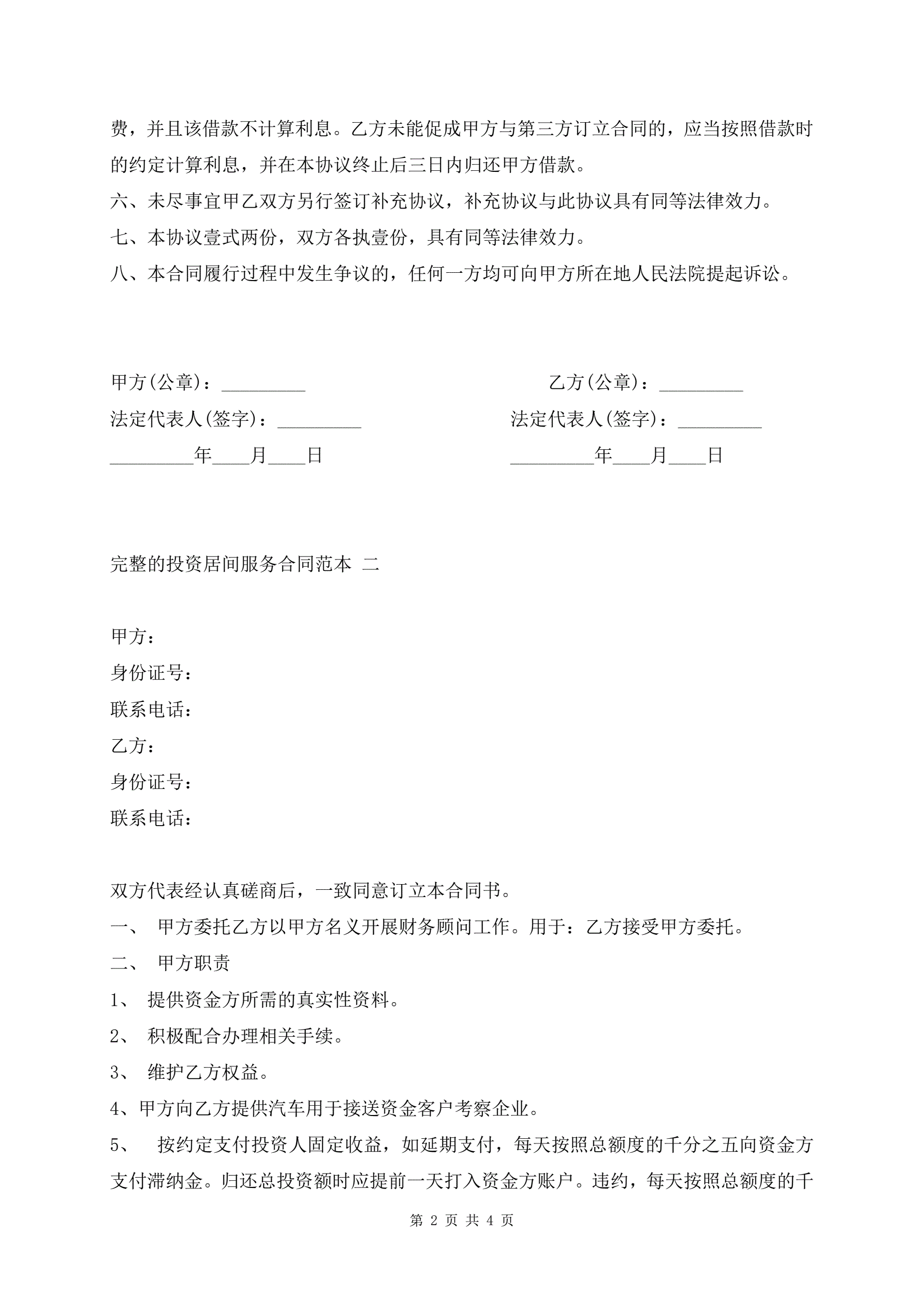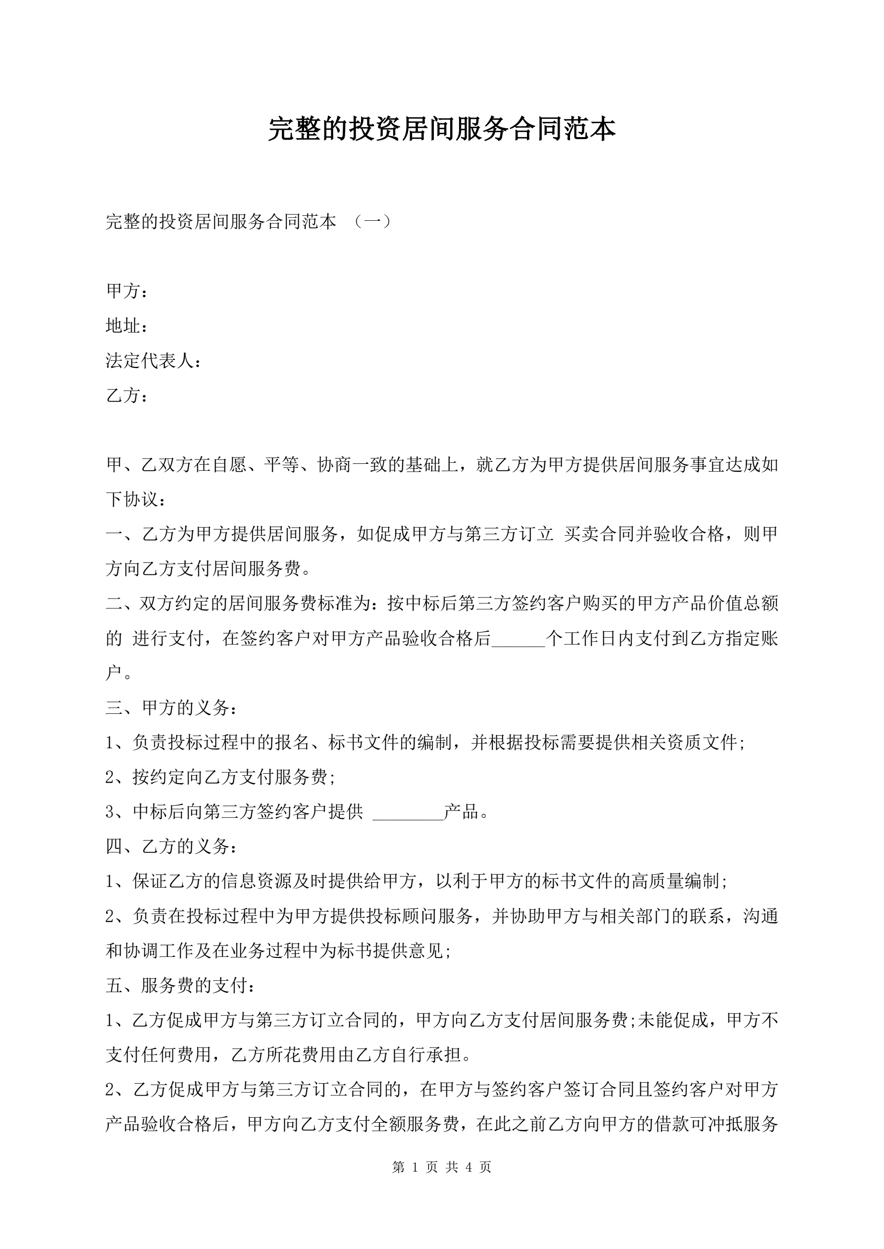 完整的投资居间服务合同范本