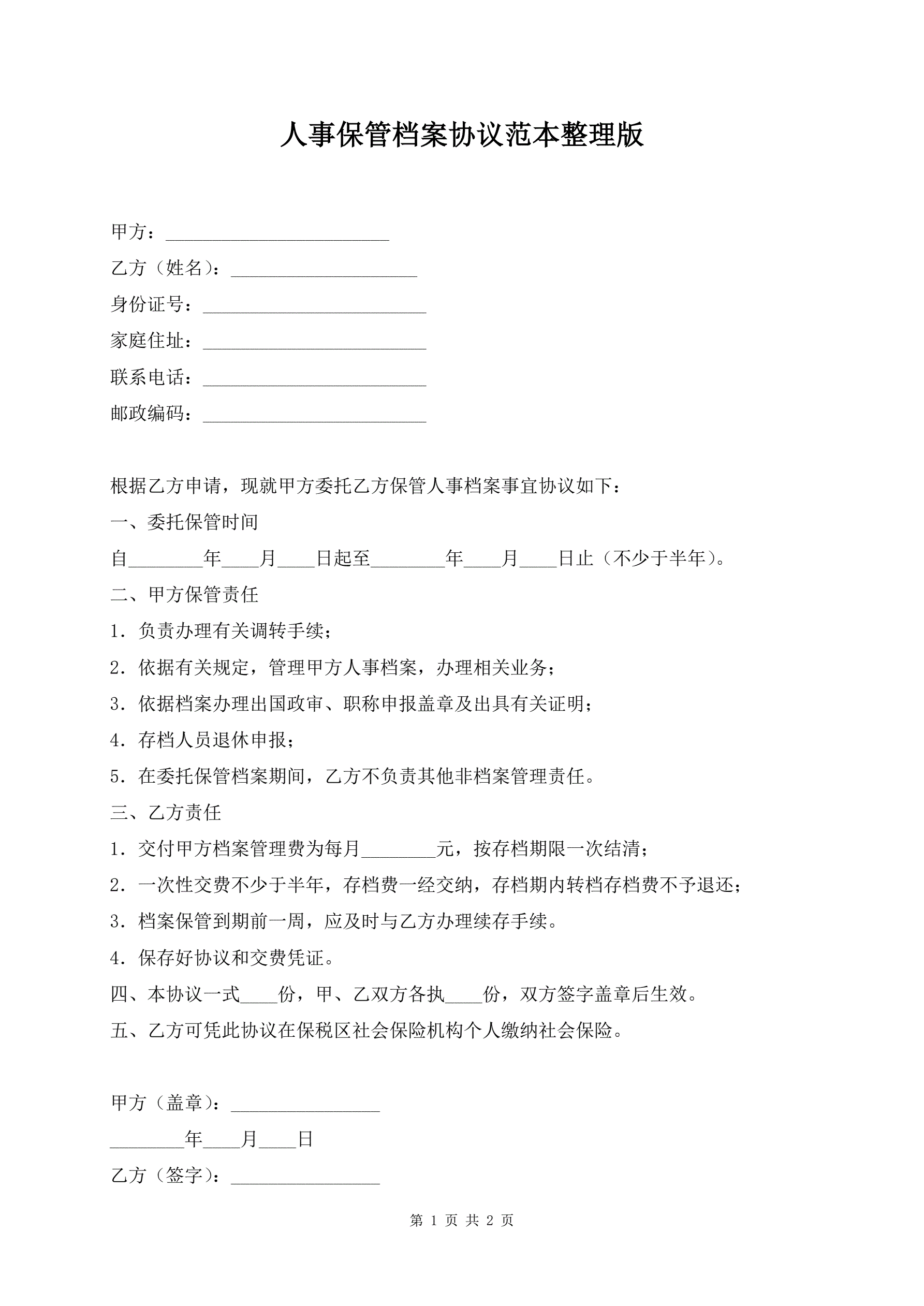 >人事保管档案协议范本整理版